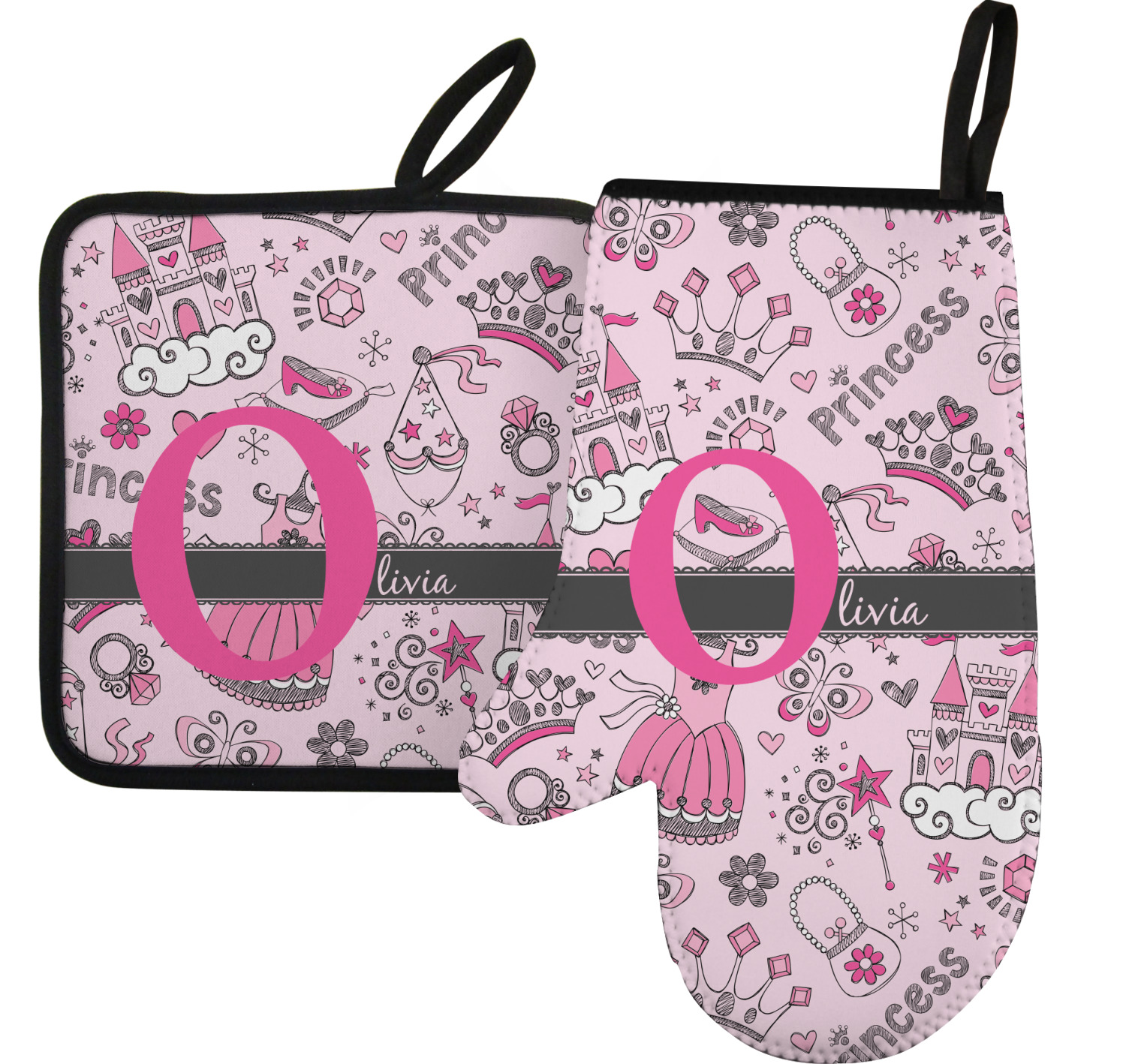 We chose to personalized the design with our Large Initial and Text on Ribbon Style. We chose the scalloped ribbon, and dark pink and dark grey for our colors. We have many princesses & women in our system - you can choose any one of those and customize to suit your personal style.