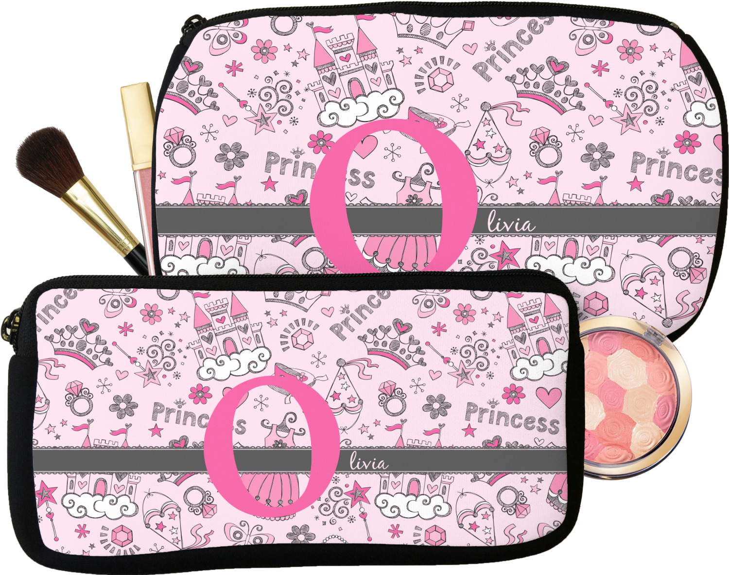 Our personalized makeup bags are available in many different designs, patterns and colors - so you are sure to find one that will love. They are made of neoprene (same material as wet-suits) and thus are water resistant, so spillages in your makeup bag will not end up all over you purse. They are customized on one side and are black on the other side and the zipper is black as well.