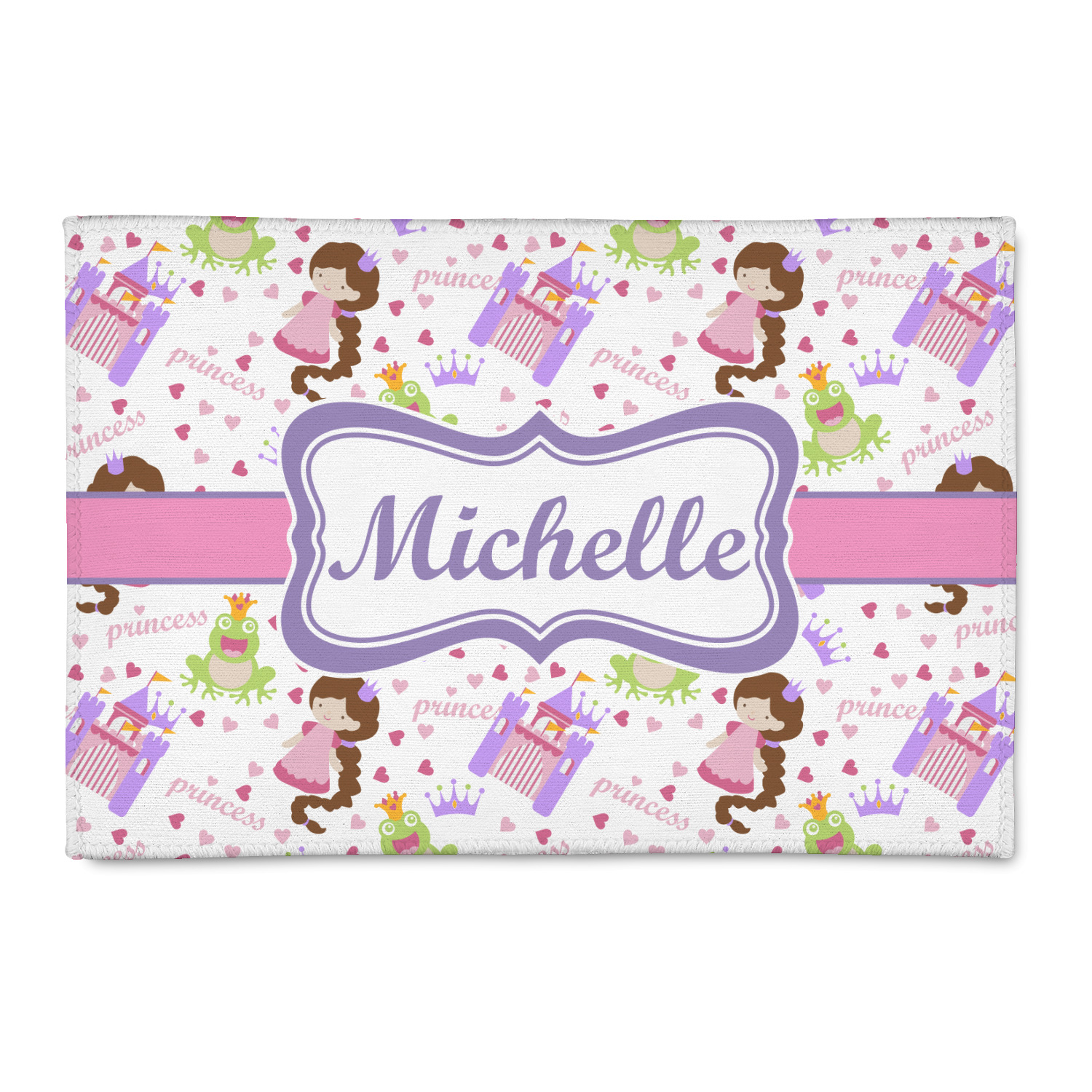 This princess themed print full of little girl pink and purple makes the statement that your little girl is The Princess. This print features every princess's dream full of castles, crowns, her very own prince frog to kiss, and lots of hearts fluttering about.