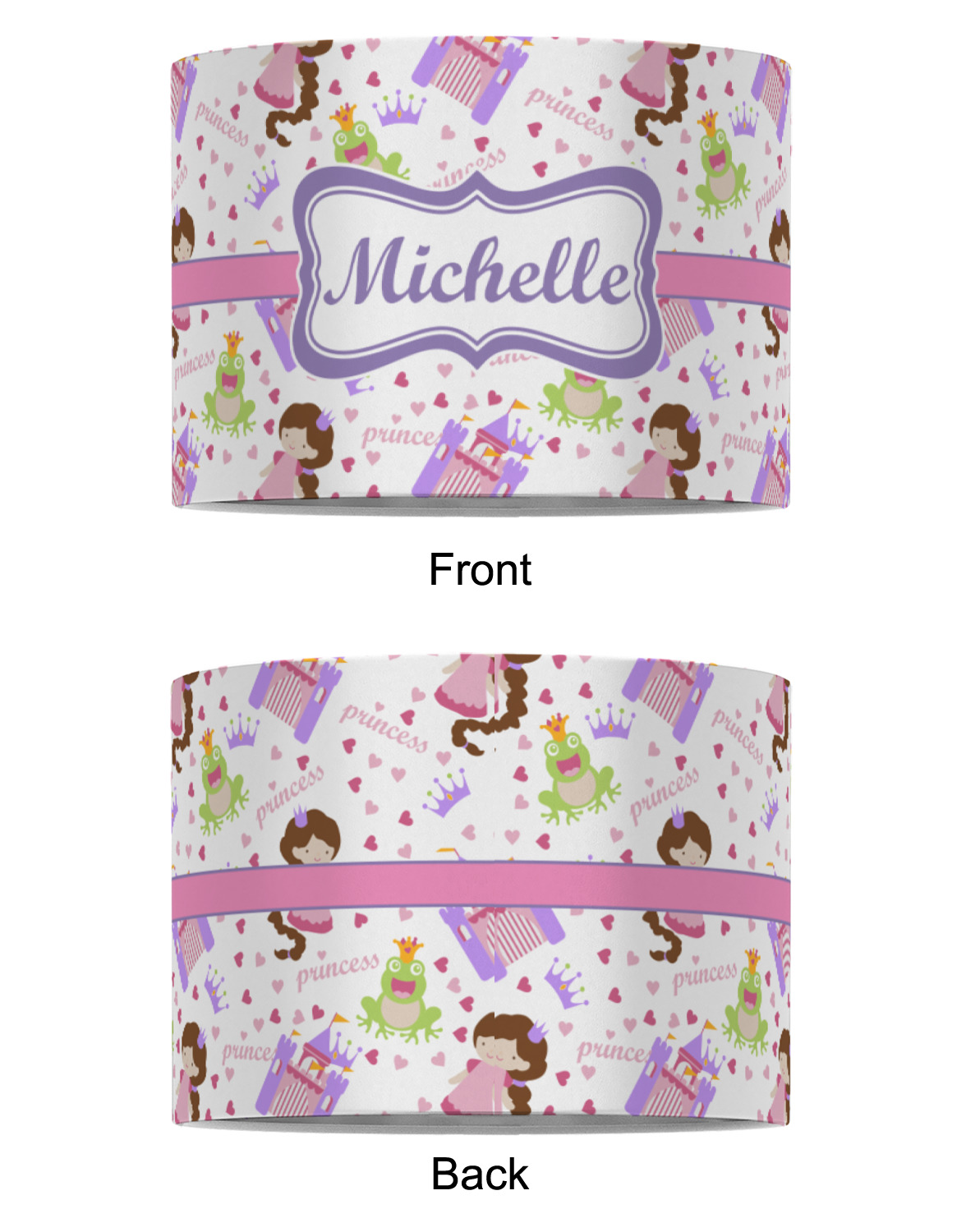 This princess themed print full of little girl pink and purple makes the statement that your little girl is The Princess. This print features every princess's dream full of castles, crowns, her very own prince frog to kiss, and lots of hearts fluttering about.