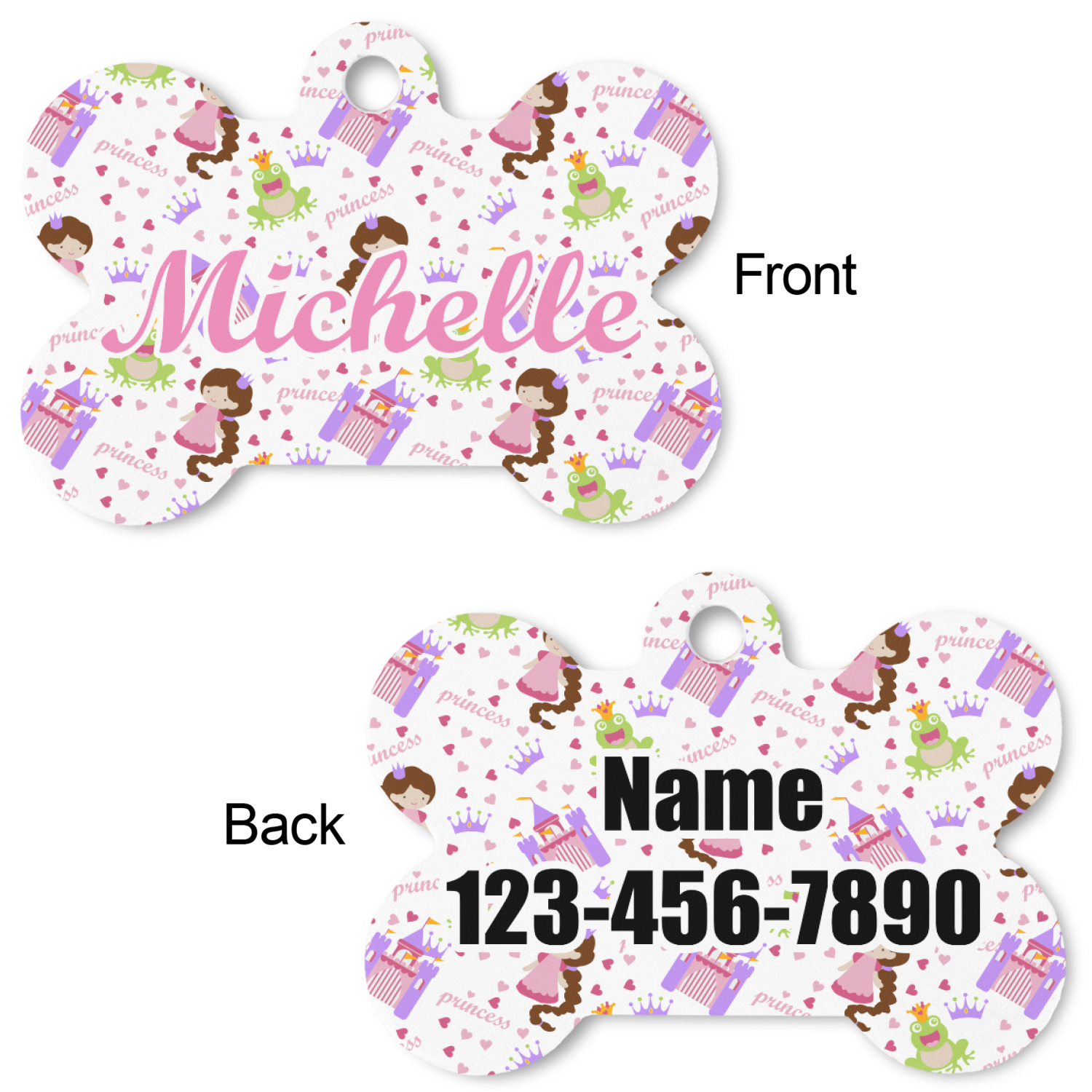 Our default design templates print your dog's personalization on the front and your contact information on the back; however everything is customizable, so you customize the patterns, the colors, the personalization, the contact information etc.