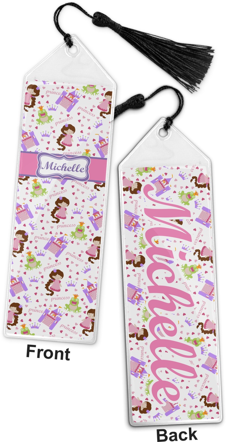 Your personalized bookmark is made of a sturdy, clear vinyl, and is approximately 7.5" x 2.25". We display your personalization on vinyl inserts that are placed on both sides. Accompanying each book marker is a black, fringe tassel that attaches to the reinforced, triangular header.