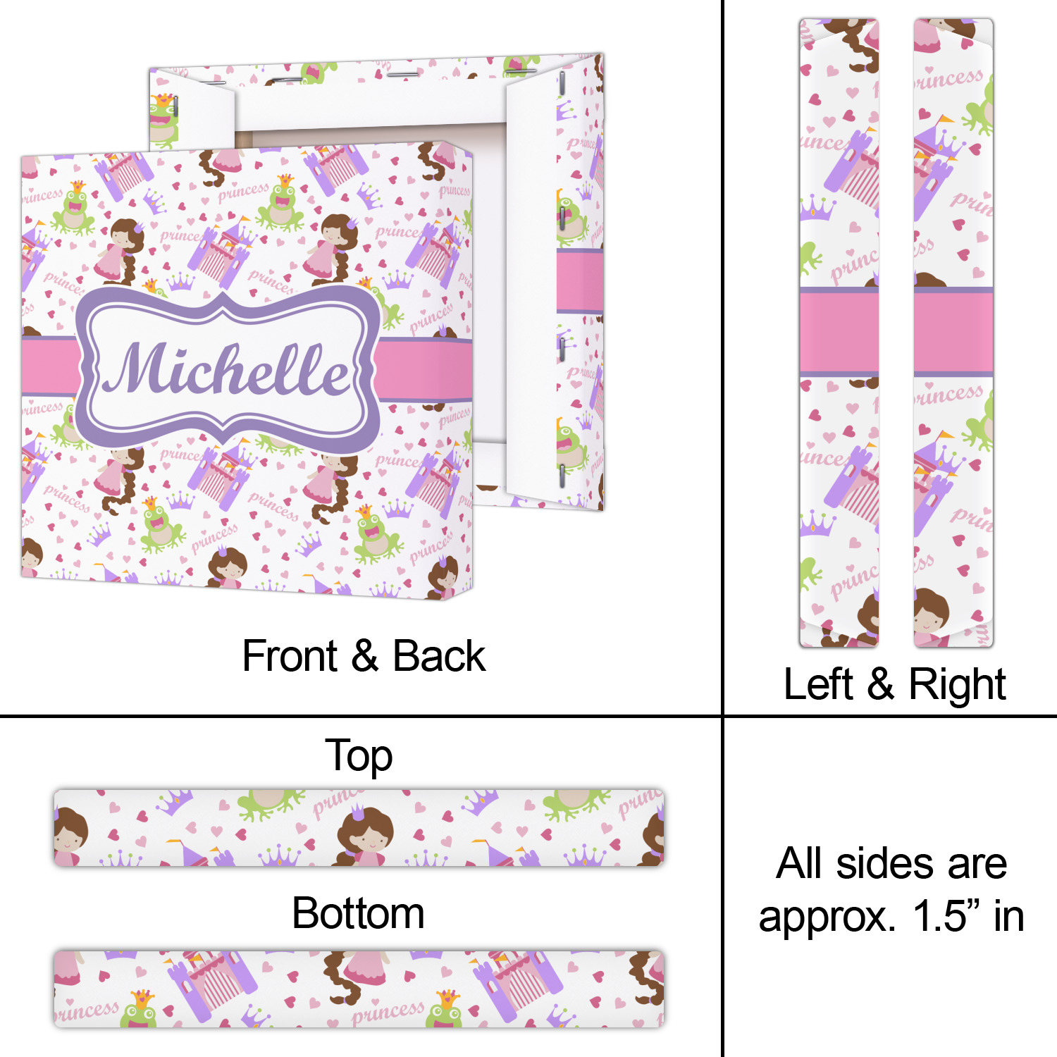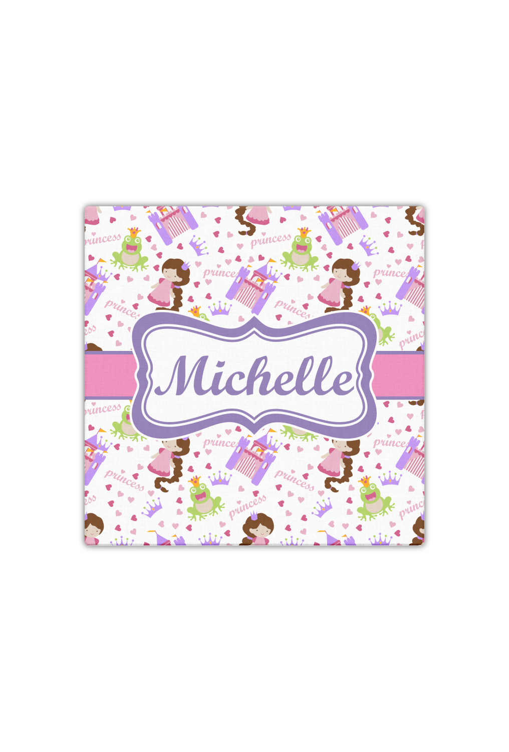This princess themed print full of little girl pink and purple makes the statement that your little girl is The Princess. This print features every princess's dream full of castles, crowns, her very own prince frog to kiss, and lots of hearts fluttering about.