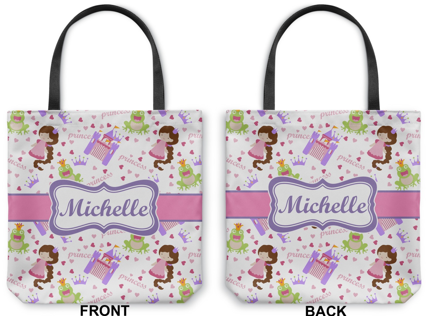 This princess themed print full of little girl pink and purple makes the statement that your little girl is The Princess. This print features every princess's dream full of castles, crowns, her very own prince frog to kiss, and lots of hearts fluttering about.