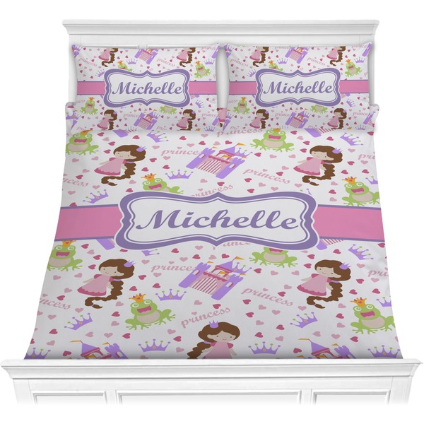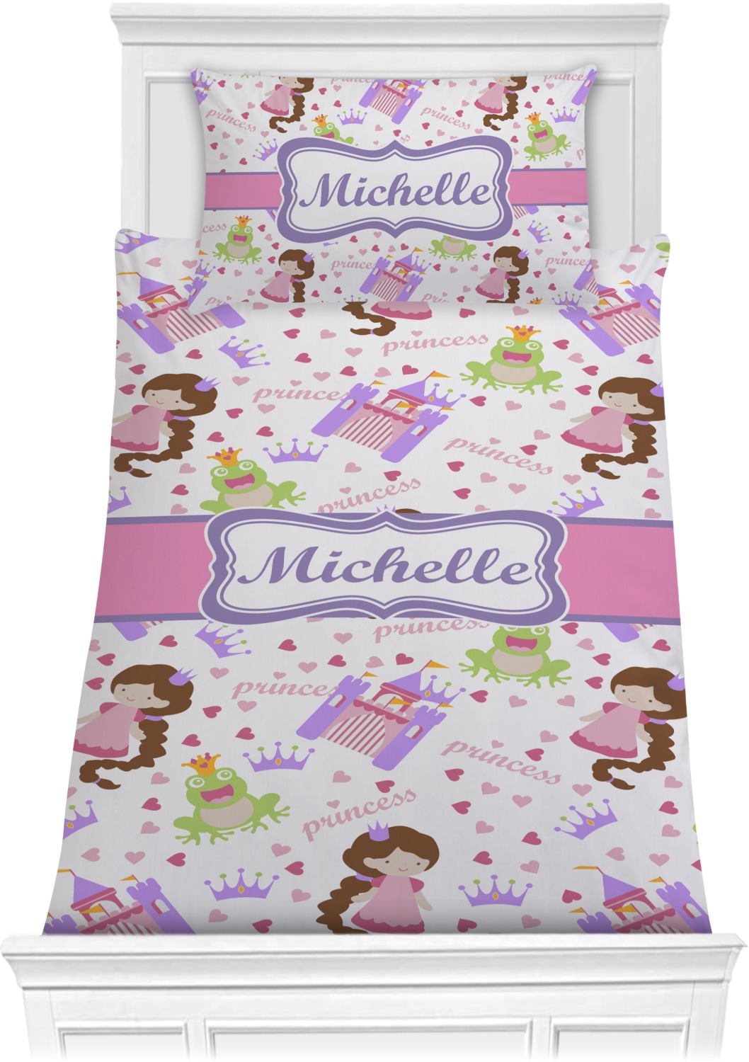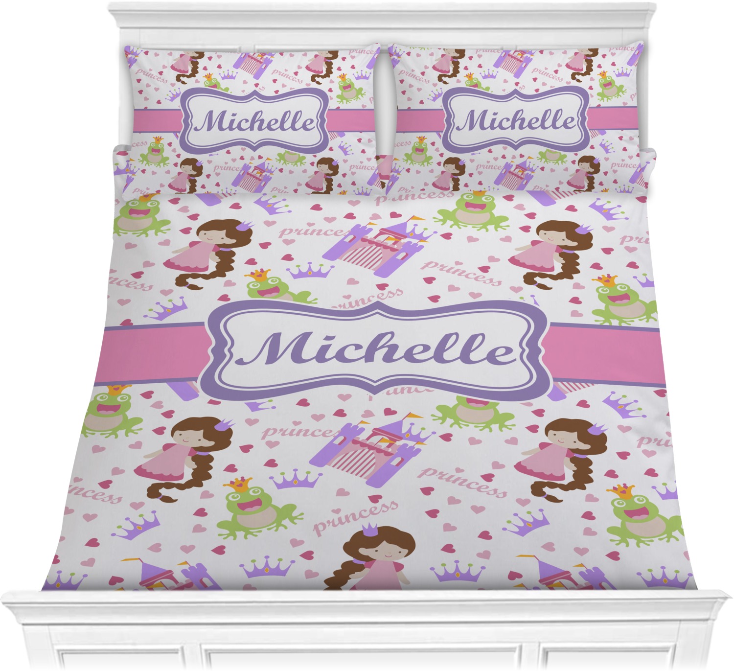 This princess themed print full of little girl pink and purple makes the statement that your little girl is The Princess. This print features every princess's dream full of castles, crowns, her very own prince frog to kiss, and lots of hearts fluttering about.