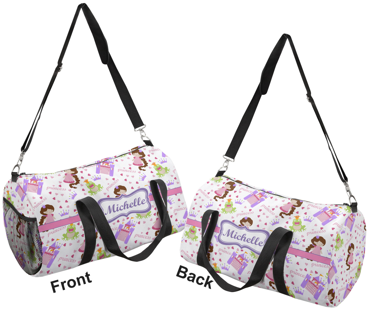 This duffle is a sturdy bag made of a canvas material. It comes in two sizes: Small (19"W x 9.5"H x 9.5"D) and Large (23"W x 12"H x 12"D). The bag is a cylindrical shape with a black adjustable strap and two handles. On one side is an elastic pouch to put a waterbottle or other small item. Your product will be sublimated with your design and is able to be designed on the front, back, and sides. Be sure to remember that the straps may cut into parts of your design if you upload your own artwork.