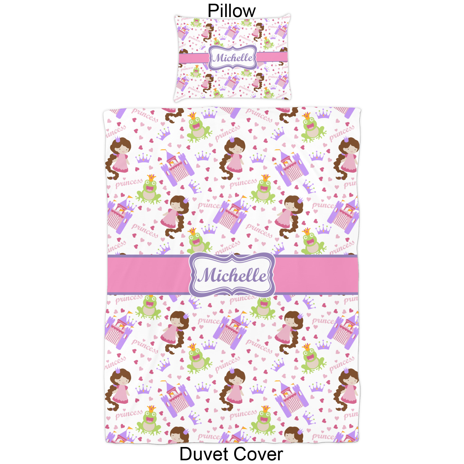 This princess themed print full of little girl pink and purple makes the statement that your little girl is The Princess. This print features every princess's dream full of castles, crowns, her very own prince frog to kiss, and lots of hearts fluttering about.