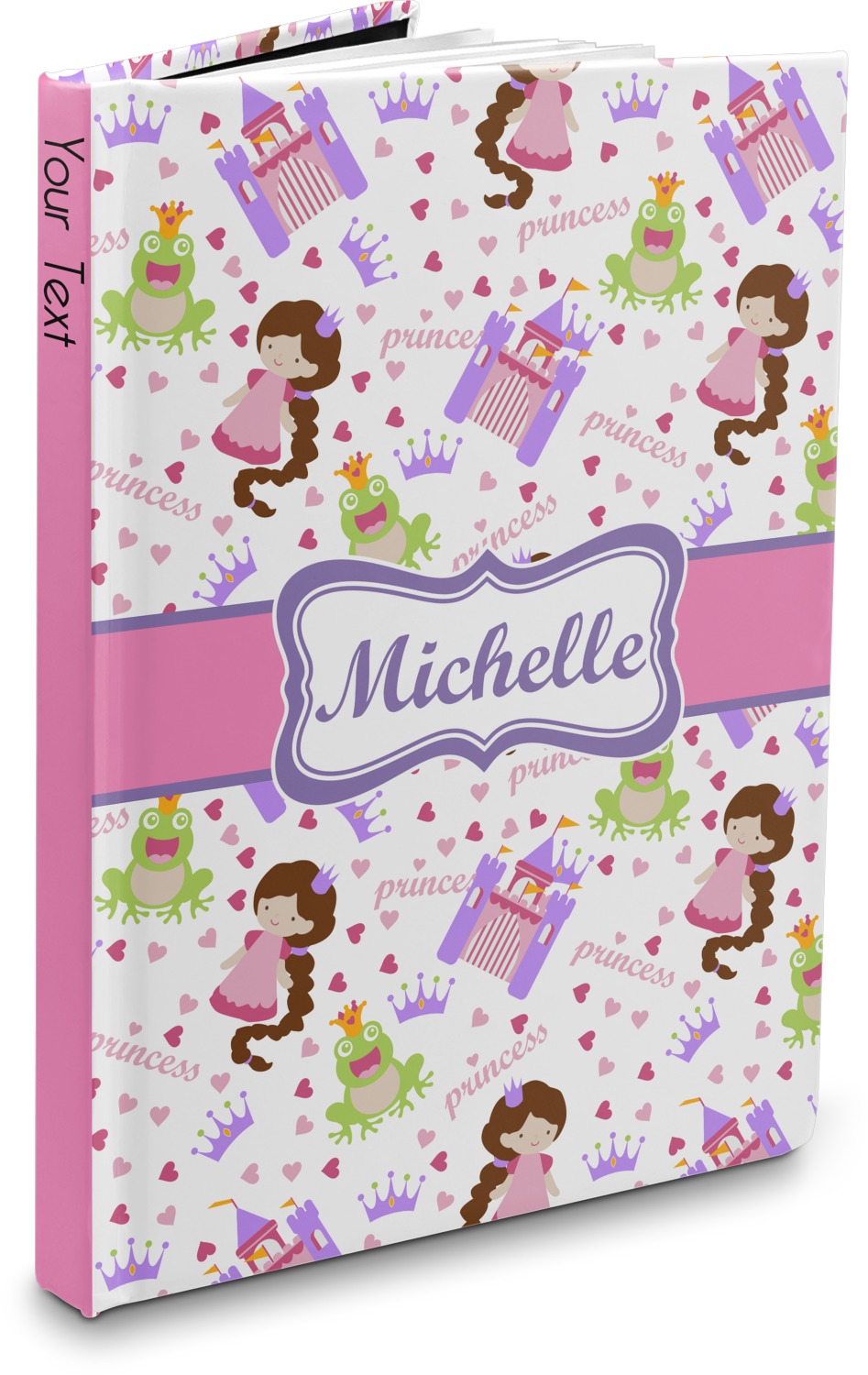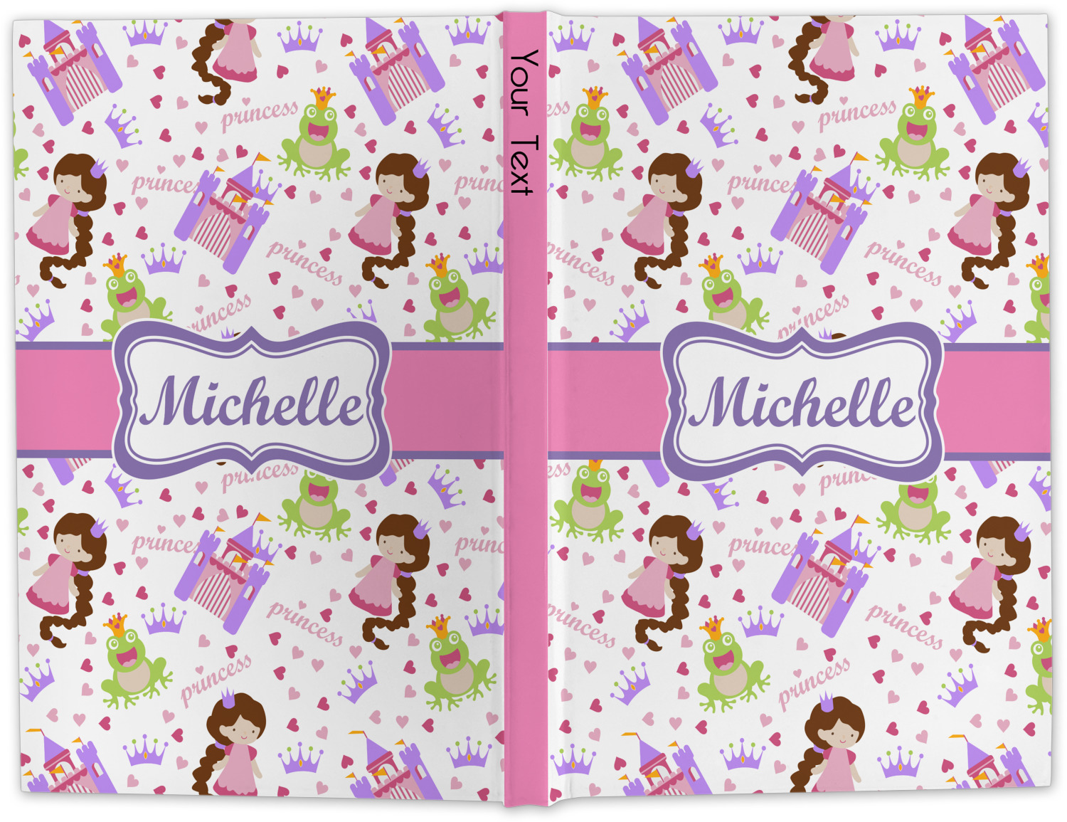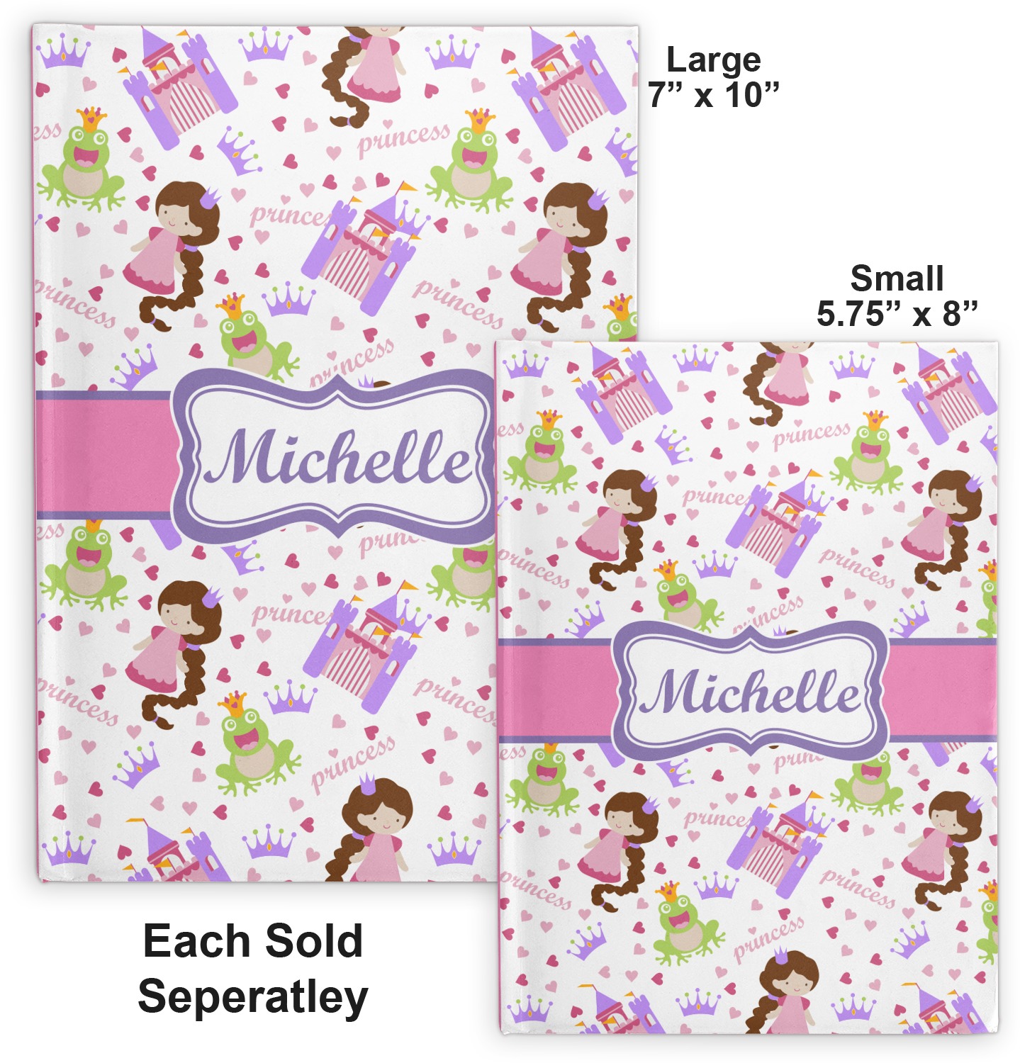 This princess themed print full of little girl pink and purple makes the statement that your little girl is The Princess. This print features every princess's dream full of castles, crowns, her very own prince frog to kiss, and lots of hearts fluttering about.