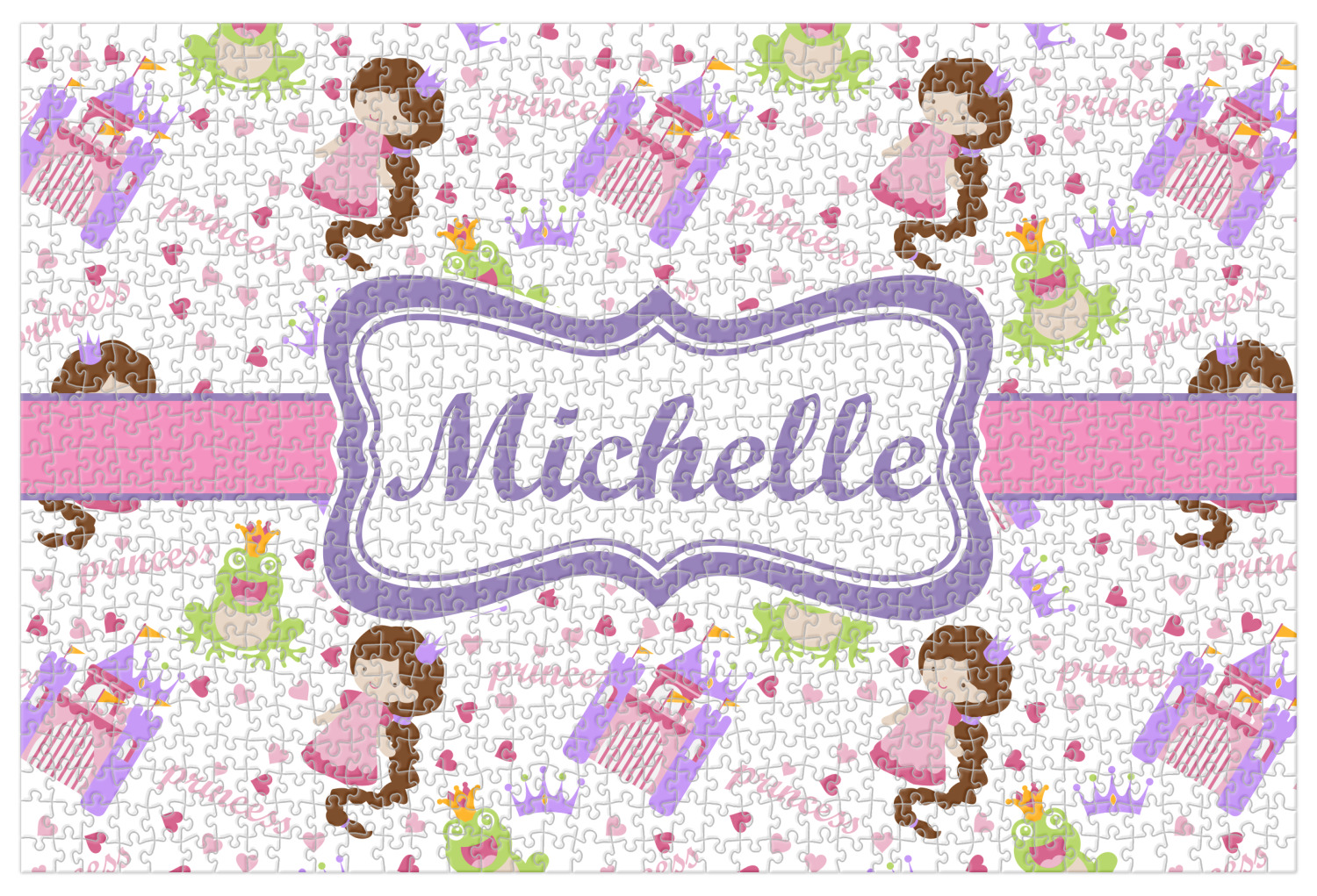 This princess themed print full of little girl pink and purple makes the statement that your little girl is The Princess. This print features every princess's dream full of castles, crowns, her very own prince frog to kiss, and lots of hearts fluttering about.