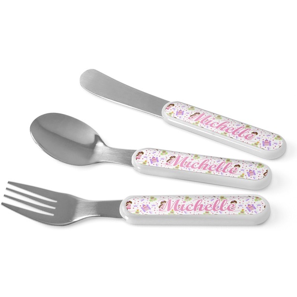 This set of kids' silverware includes a 5.5 inch spoon, fork, and knife, catered to your little one's needs. The prongs of this fork are flat and dull, while our spoon is small enough for tiny mouths, and the dullness of the knife itself resembles a butter knife, at most. These kids' utensils are made of stainless steel, while the handles are crafted from a durable plastic that will withstand the energy and use of your young one. We print your customization across the handles, making the cutlery set unique to your child only.