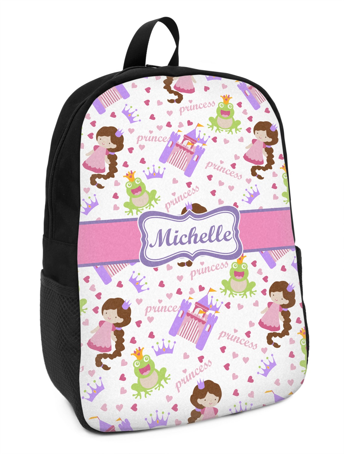 These small backpacks are made of a durable black canvas material with your personalization right on the front. The two shoulder straps are padded and easily adjustable. The bag itself measures at about 11" W x 15" H x 5" D. It's the perfect size for elementary aged kids or adults who want a smaller backpack. On the top of the bag you will find a handle to hang or carry your backpack by as well as a large zipper closure to keep all of your belongings safe inside. On each side of your backpack is a mesh pocket for a small item or water bottle. Inside your backpack you will find a spacious area with a small zipper pocket and a padded laptop slot that will fit up to a 13" laptop (13" being very snug). This is the perfect bag for any student that needs a couple books and their laptop with them at all times. It also works great as a carry on for traveling!