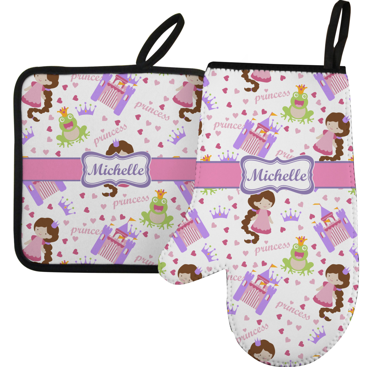 This princess themed print full of little girl pink and purple makes the statement that your little girl is The Princess. This print features every princess's dream full of castles, crowns, her very own prince frog to kiss, and lots of hearts fluttering about.