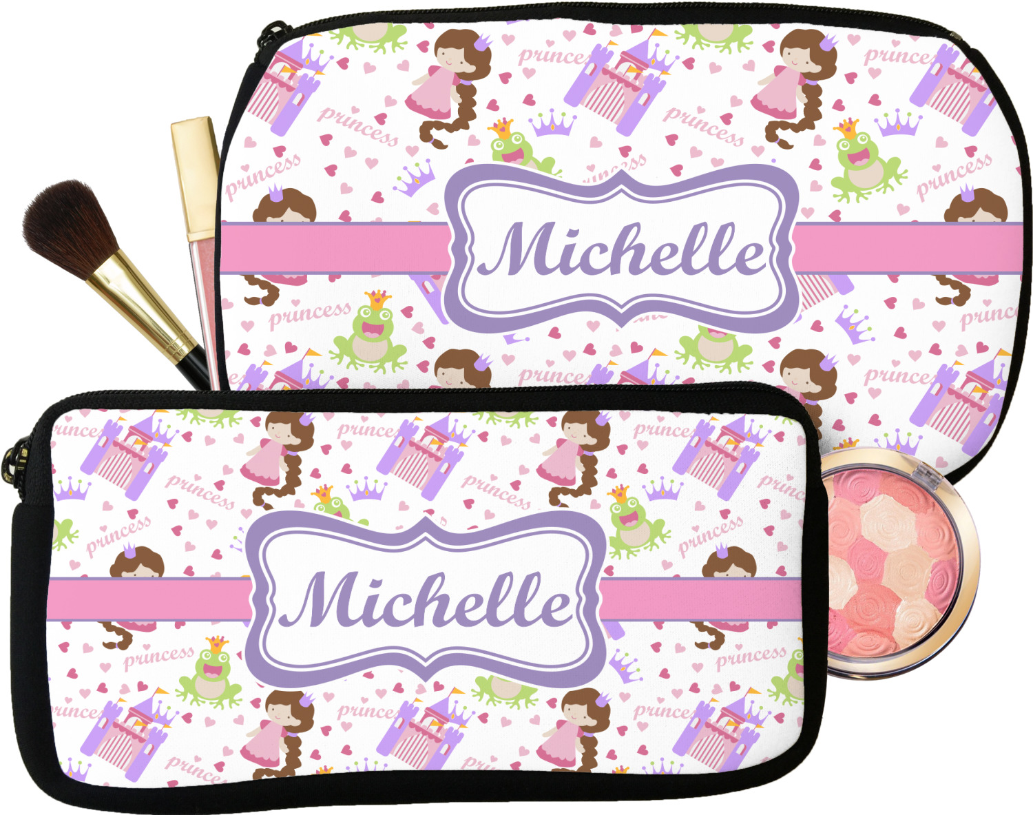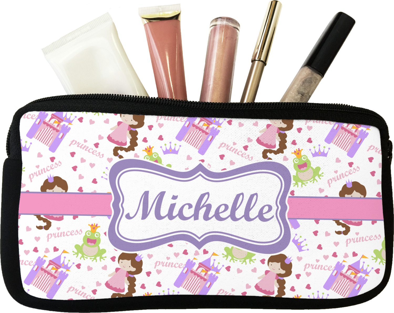 Our personalized makeup bags are available in many different designs, patterns and colors - so you are sure to find one that will love. They are made of neoprene (same material as wet-suits) and thus are water resistant, so spillages in your makeup bag will not end up all over you purse. They are customized on one side and are black on the other side and the zipper is black as well.