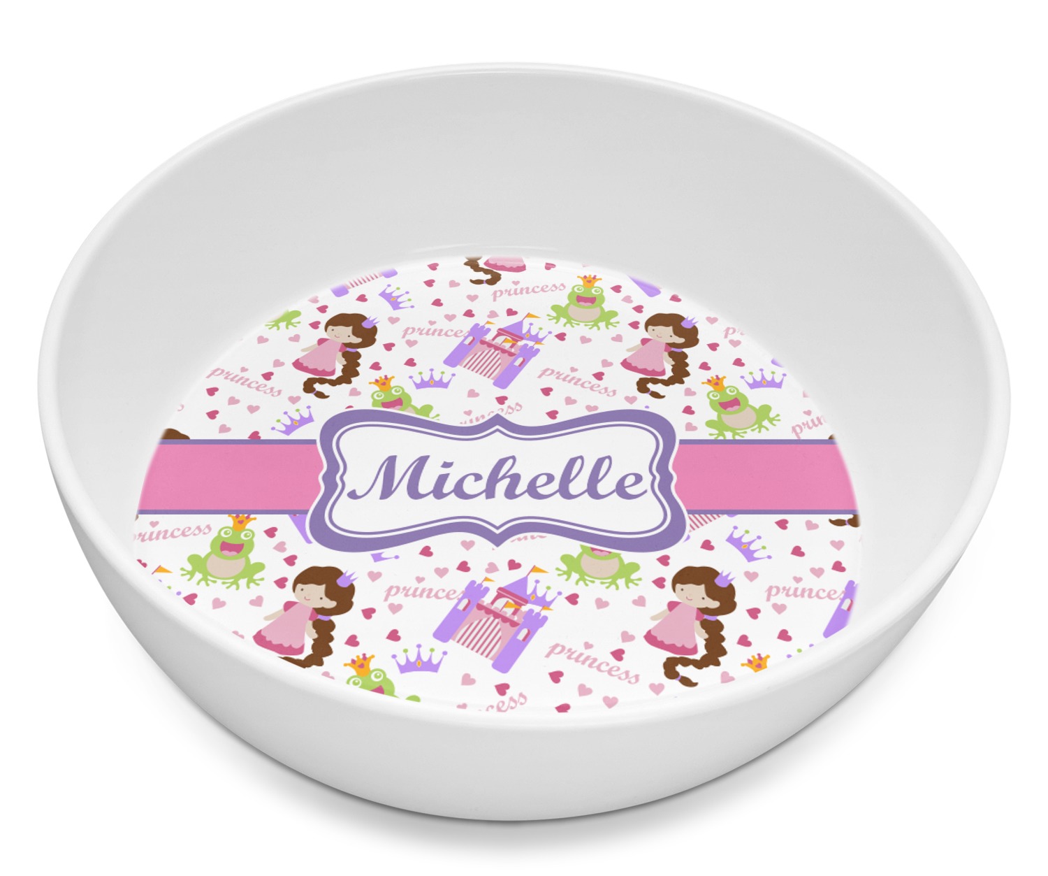 This princess themed print full of little girl pink and purple makes the statement that your little girl is The Princess. This print features every princess's dream full of castles, crowns, her very own prince frog to kiss, and lots of hearts fluttering about.