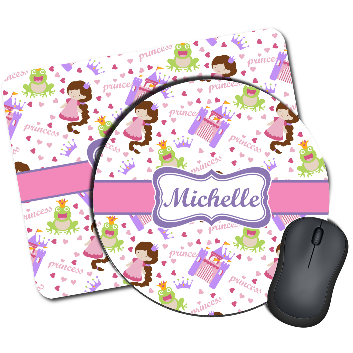 This princess themed print full of little girl pink and purple makes the statement that your little girl is The Princess. This print features every princess's dream full of castles, crowns, her very own prince frog to kiss, and lots of hearts fluttering about.