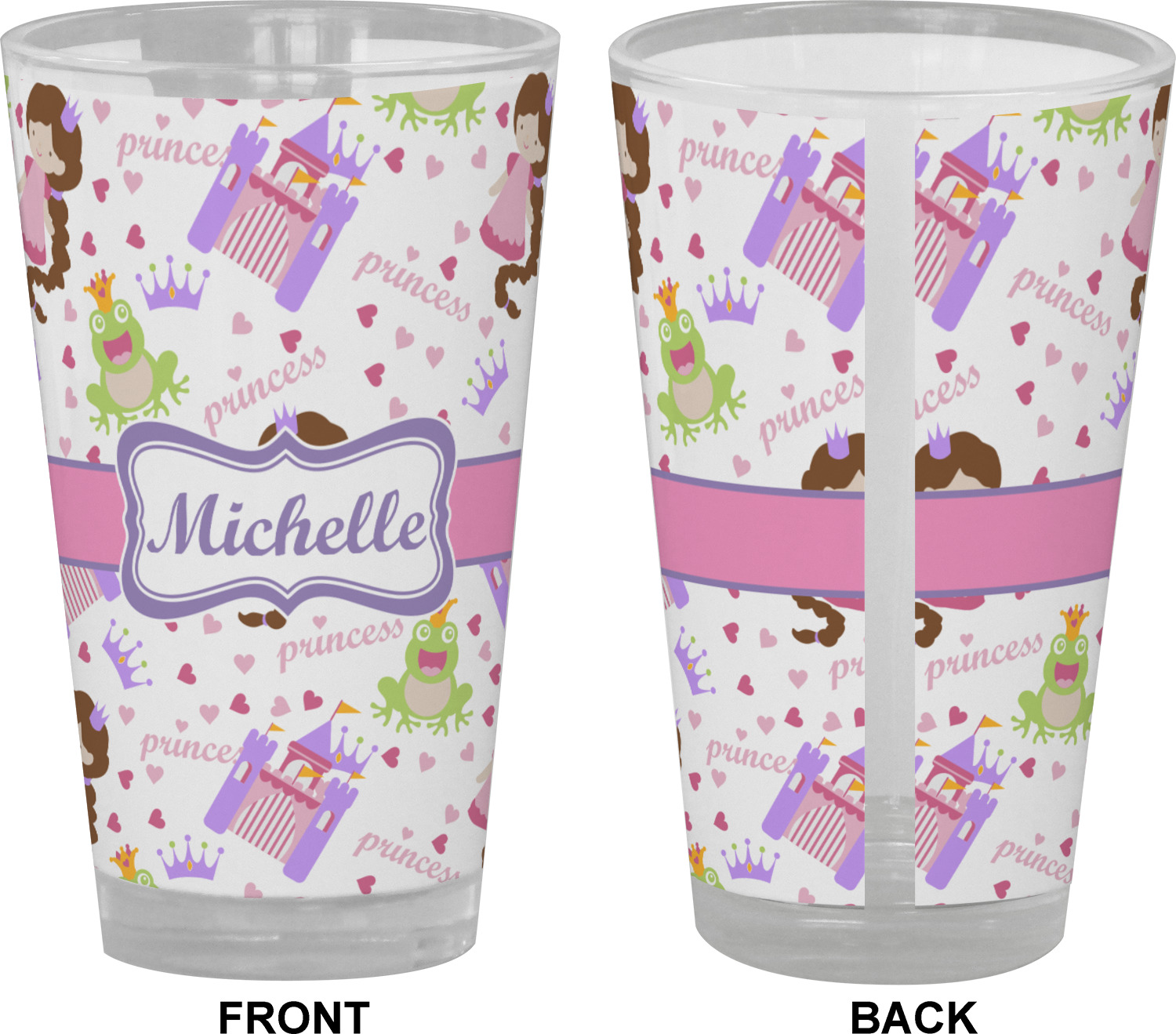 This princess themed print full of little girl pink and purple makes the statement that your little girl is The Princess. This print features every princess's dream full of castles, crowns, her very own prince frog to kiss, and lots of hearts fluttering about.