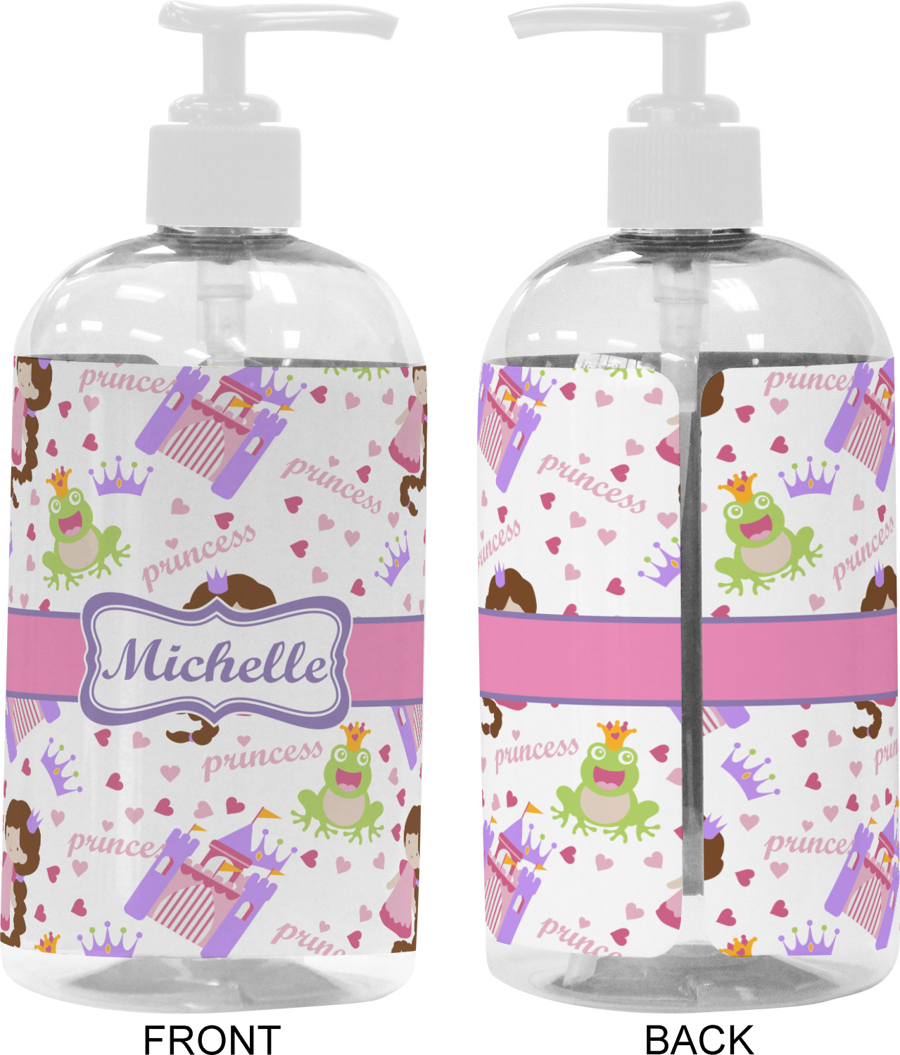 This princess themed print full of little girl pink and purple makes the statement that your little girl is The Princess. This print features every princess's dream full of castles, crowns, her very own prince frog to kiss, and lots of hearts fluttering about.