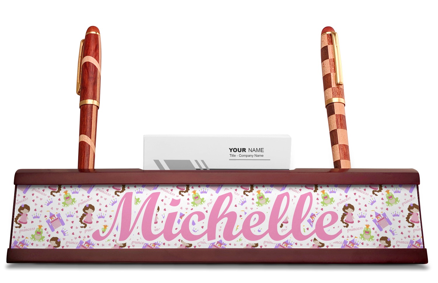 Your desk name plates are crafted from a high-quality, dark-cherry mahogany. At approximately 9.5 by 1.875 by 2.5 inches, this name plaque will fit perfectly, front and center, on your desk. Your customization spans across the entire face of the nameplate. Behind the nameplate lies a skinny slot that can fit approximately 15, traditionally-sized, business cards. You can also store your writing utensils on either side of this custom desk name plate.
