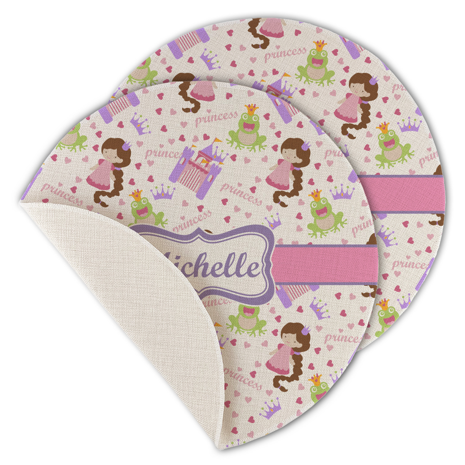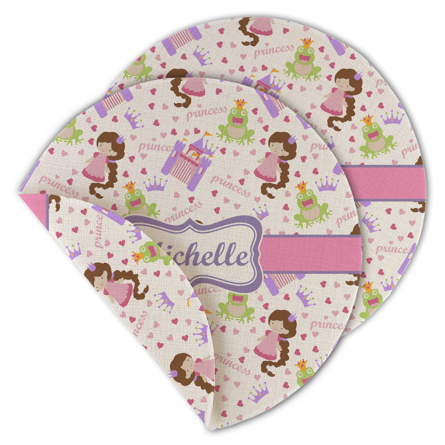 This princess themed print full of little girl pink and purple makes the statement that your little girl is The Princess. This print features every princess's dream full of castles, crowns, her very own prince frog to kiss, and lots of hearts fluttering about.