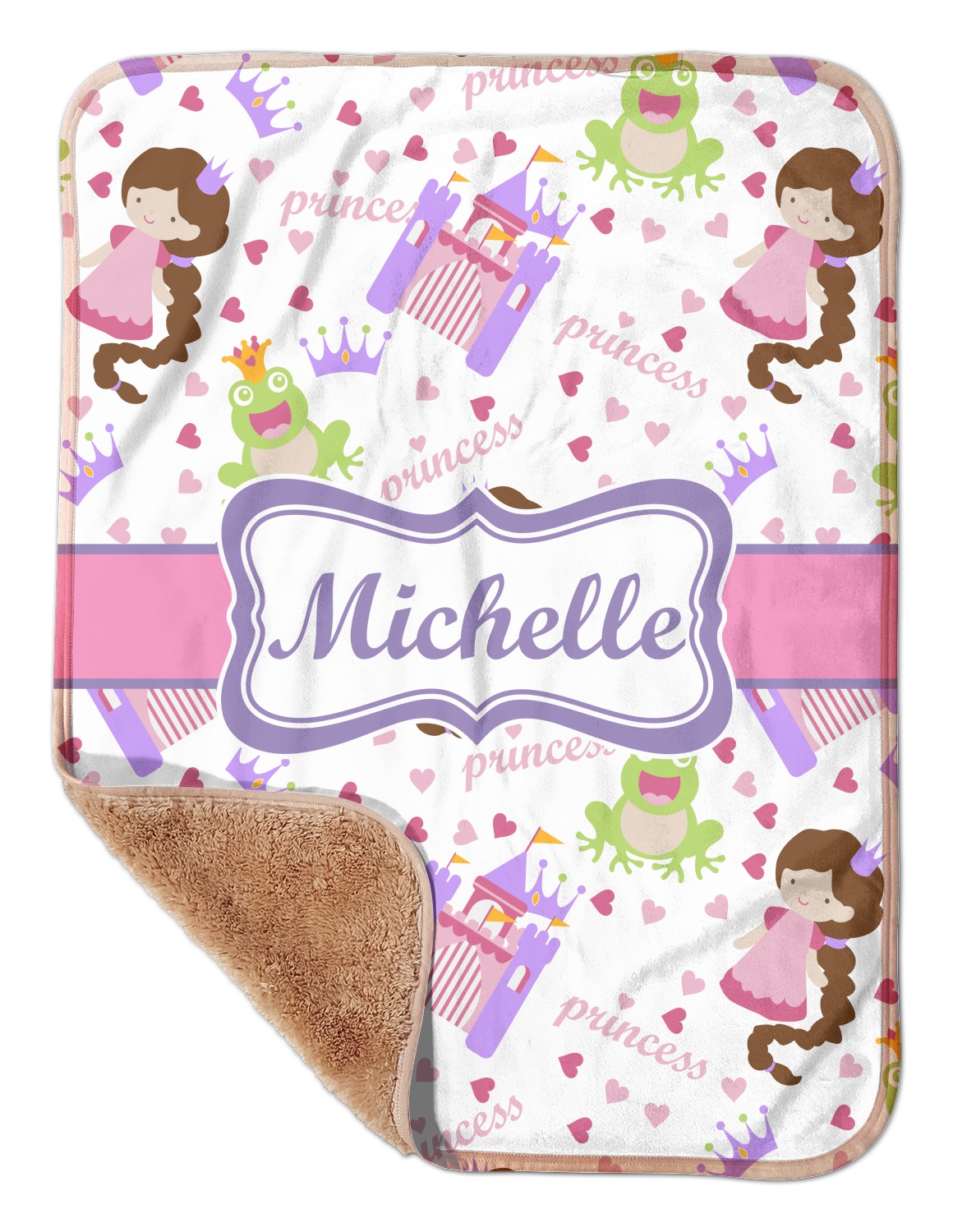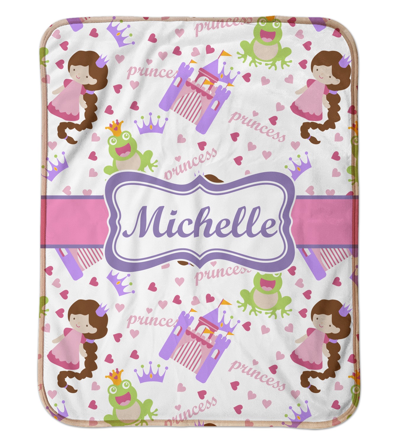 This princess themed print full of little girl pink and purple makes the statement that your little girl is The Princess. This print features every princess's dream full of castles, crowns, her very own prince frog to kiss, and lots of hearts fluttering about.