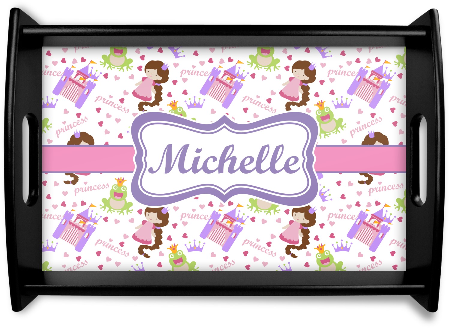 This serving tray with handles features square edges and two rounded sides, creating a very modern look. Each side is fabricated from a beautifully cut, natural wood. The bottom of the interior of the tray displays your customized design in bright, vibrant color. The tray is sold in both a black color and a natural wood look. Each variation of the wood serving tray has two sizes: Small, which is 14" x 10" x 2.25", and Large, which is 19.5" x 13.5" x 2.75".