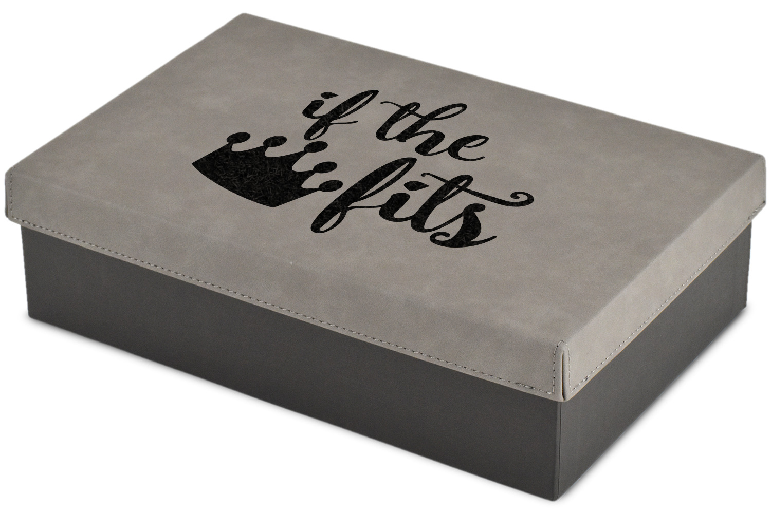 These gift boxes are available in 3 different sizes to accommodate various sized gifts. Available in gray as a neutral color for any occasion as well as to showcase your design boldly. Engraved with a laser this high quality paper board and faux leather gift box is unique and makes any gift stand out.