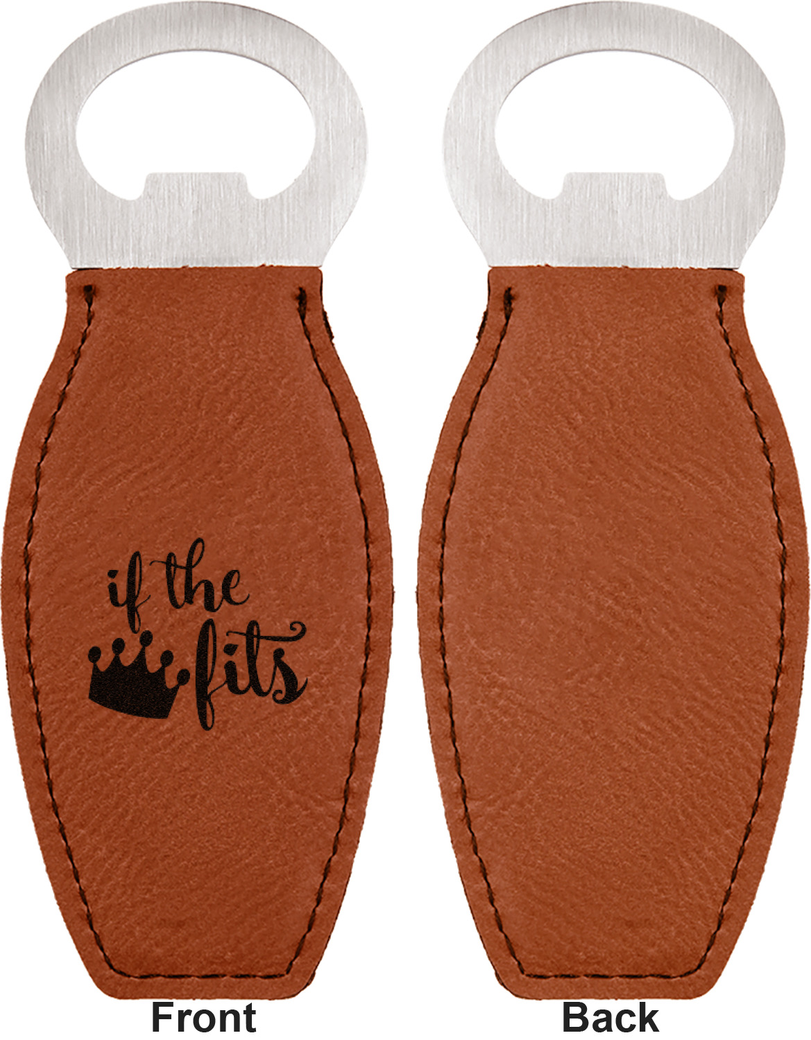 Built from stainless steel, these custom bottle openers are wrapped in a cognac-colored leatherette. Sharp, black stitching lines the edges for extra durability and a finished touch. Your personalization is laser-engraved onto the surface of this leatherette, leaving behind a crisp, black coloration. At 4.6 by 1.8 inches, this beer bottle opener gives you much of leverage when trying to open a stubborn bottle. On the opposite end of the opener, you'll find a magnet that you can use to display your new, unique bottle opener!