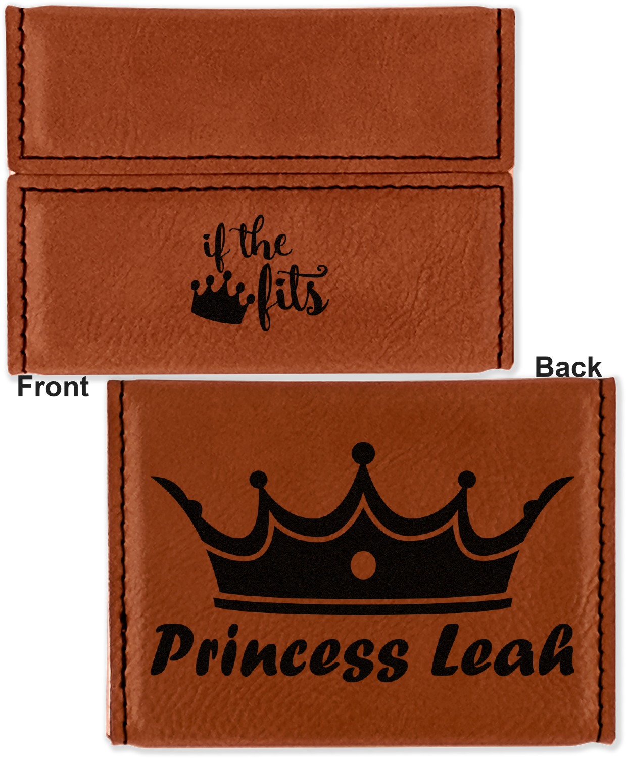 Your personalized design is laser engraved onto either the front, or the front and back of the card holder, depending on the model you purchase. Once engraved, the design will appear a darkened black against the cognac color of the leatherette.