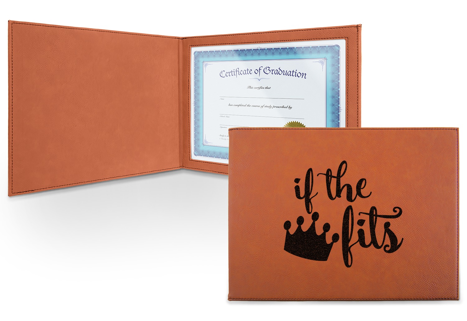 This cognac-colored, leatherette certificate jacket is the ideal way to display or store your hard-earned certificate. When closed, the custom certificate holder measures at 12 by 9 inches. The interior of the certificate cover includes a clear, vinyl window to encase your diploma. The window measures at around 10.5 by 7.5 inches and can accommodate a diploma that measures at up to 8.5 by 11 inches. You can either choose to have your customization laser engraved on the front and interior, or solely the front.