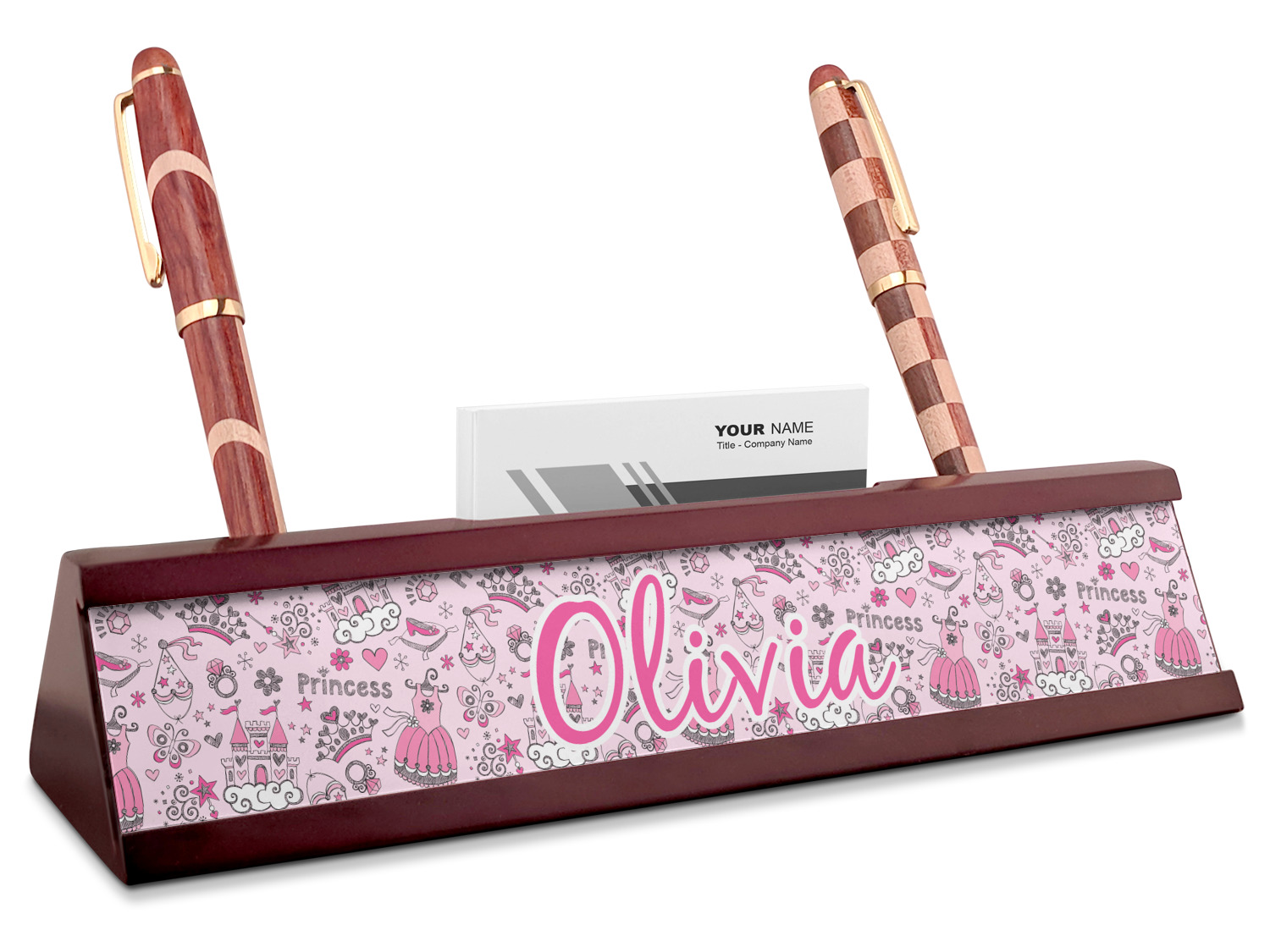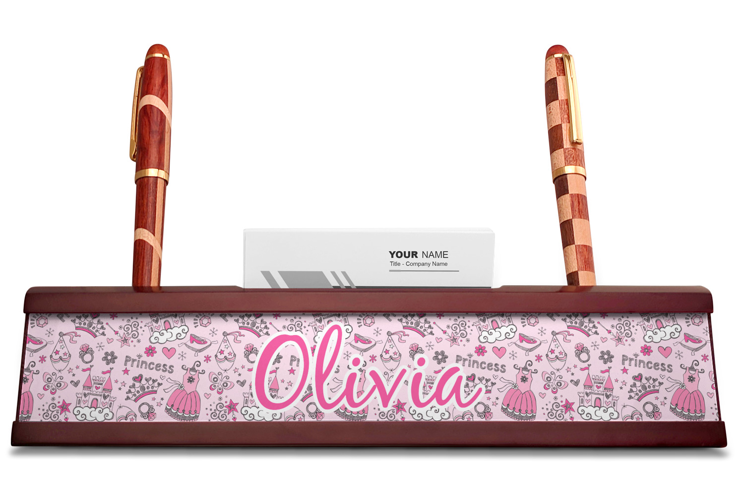 Your desk name plates are crafted from a high-quality, dark-cherry mahogany. At approximately 9.5 by 1.875 by 2.5 inches, this name plaque will fit perfectly, front and center, on your desk. Your customization spans across the entire face of the nameplate. Behind the nameplate lies a skinny slot that can fit approximately 15, traditionally-sized, business cards. You can also store your writing utensils on either side of this custom desk name plate.