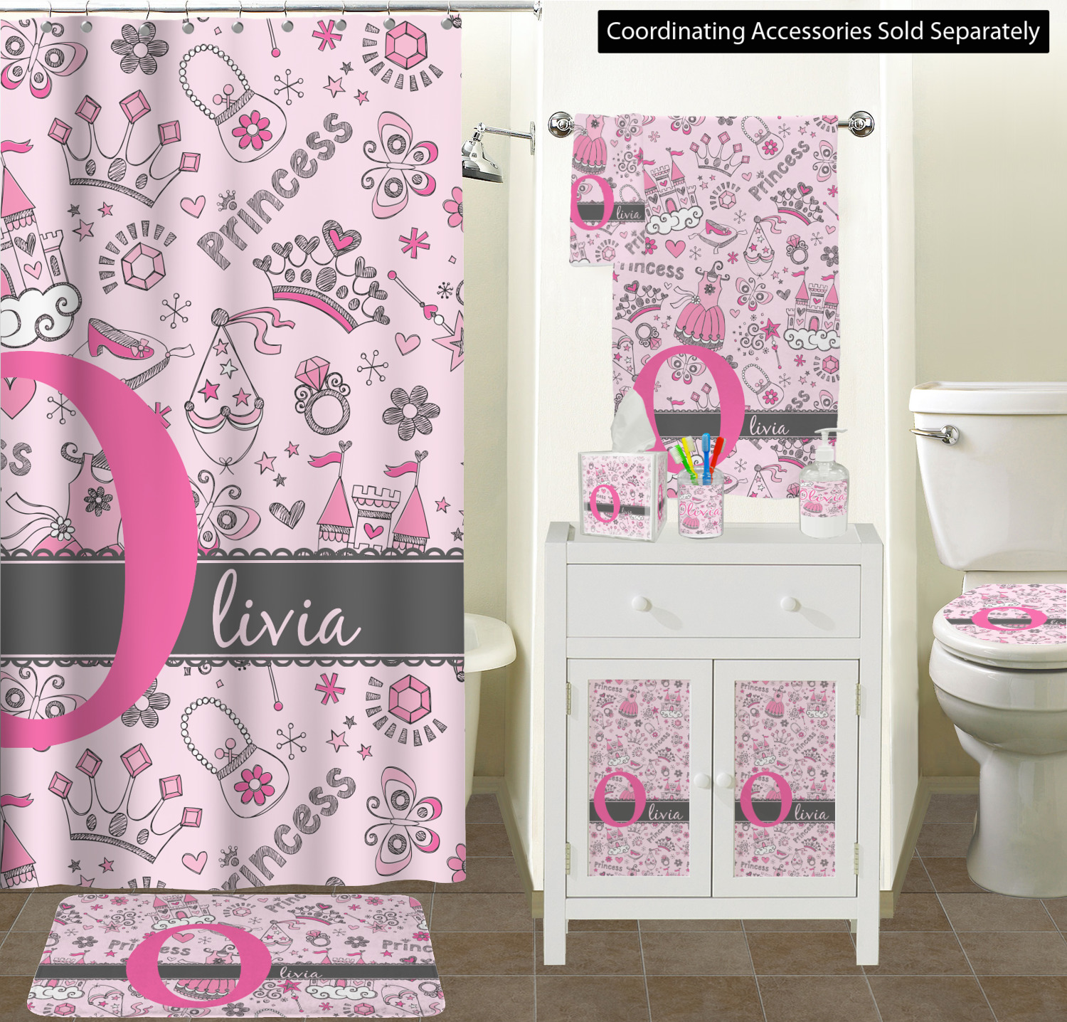 We chose to personalized the design with our Large Initial and Text on Ribbon Style. We chose the scalloped ribbon, and dark pink and dark grey for our colors. We have many princesses & women in our system - you can choose any one of those and customize to suit your personal style.