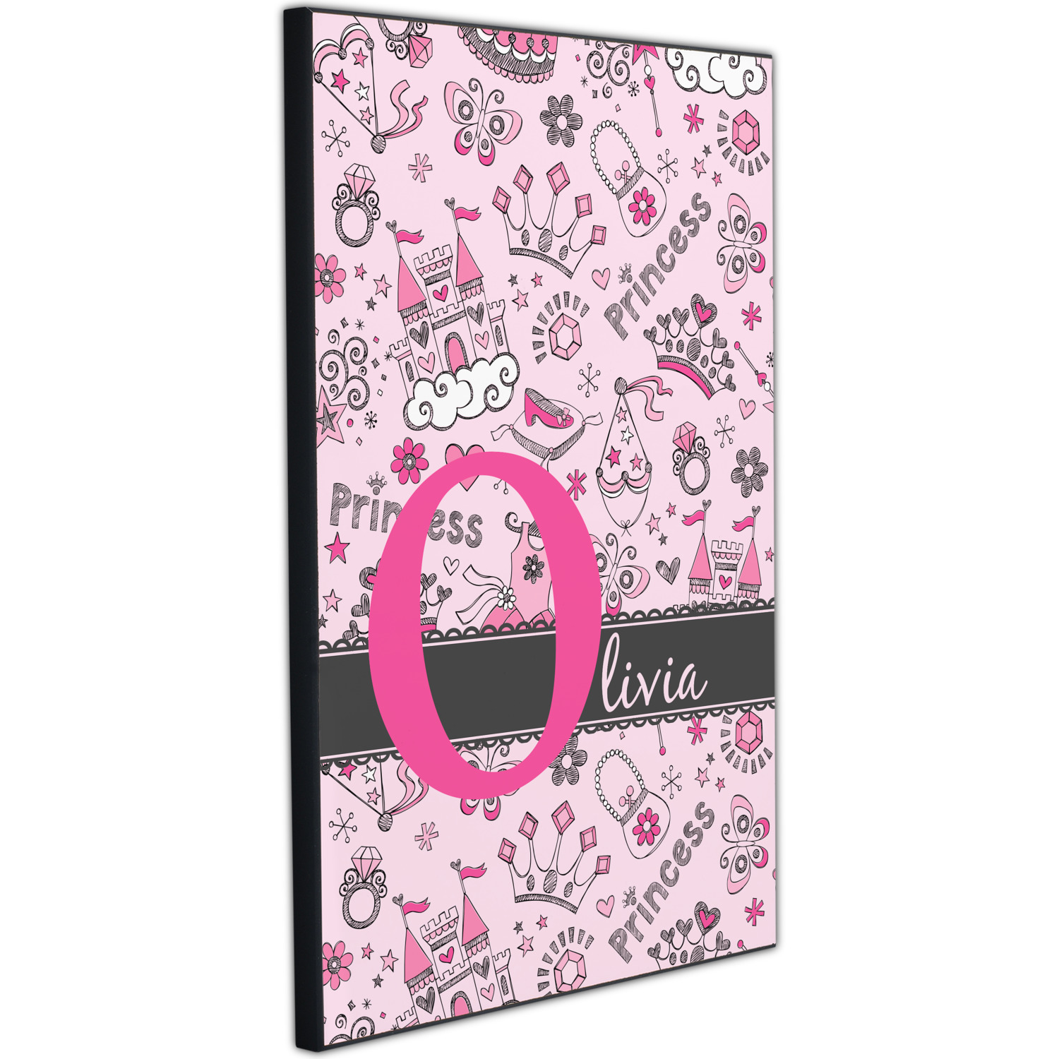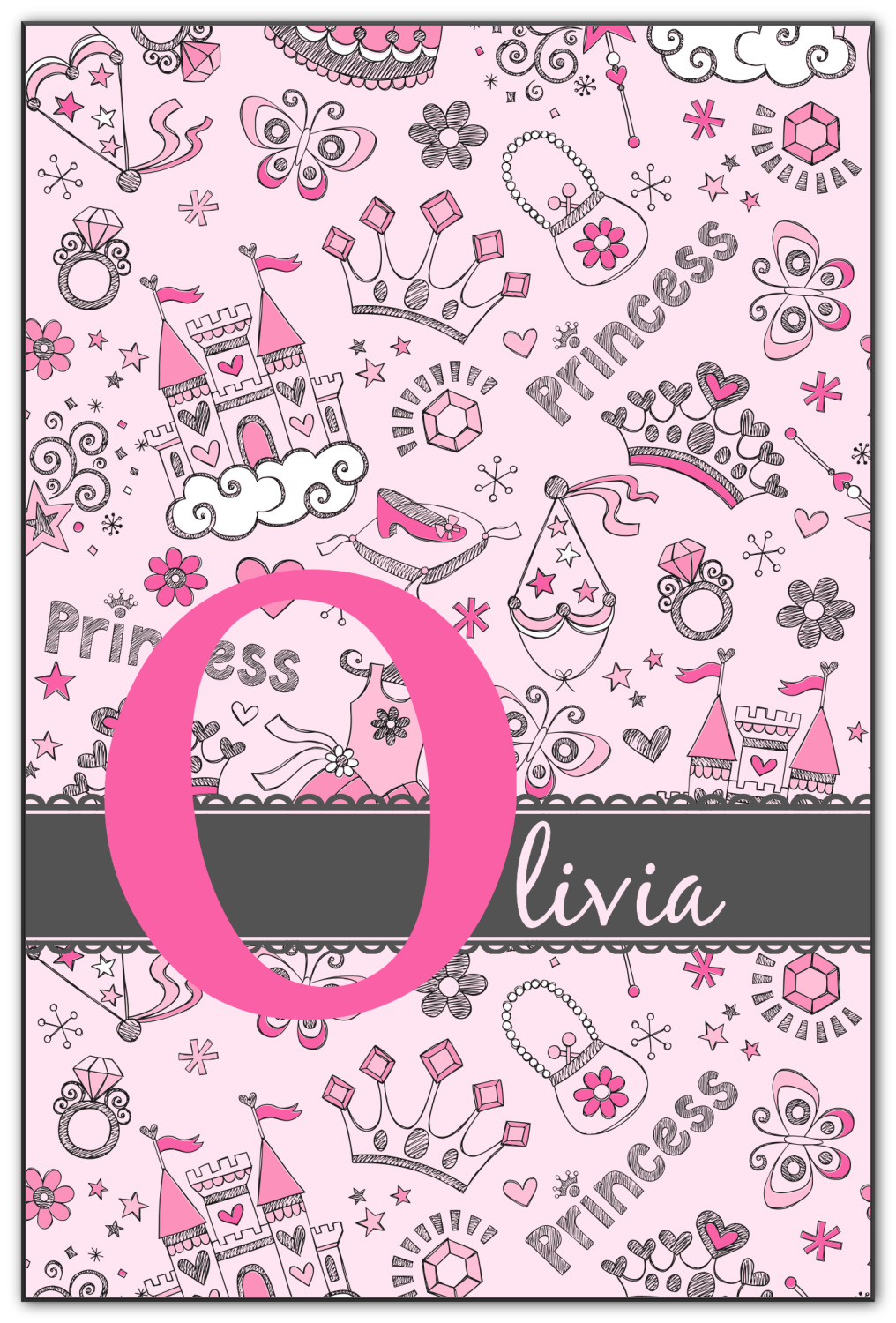 We chose to personalized the design with our Large Initial and Text on Ribbon Style. We chose the scalloped ribbon, and dark pink and dark grey for our colors. We have many princesses & women in our system - you can choose any one of those and customize to suit your personal style.