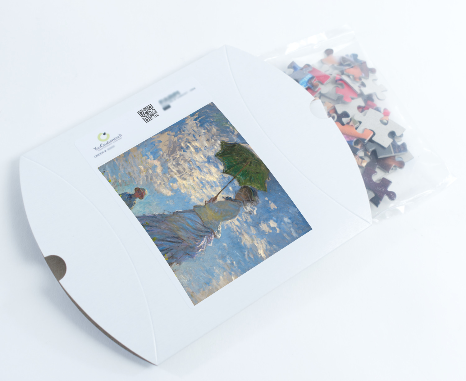 We print our puzzles on thick white chipboard in vibrant colors, then laminate the chipboard and die cut your puzzle. Your jigsaw puzzle is shipped to you in a box with the image of the puzzle on the box.