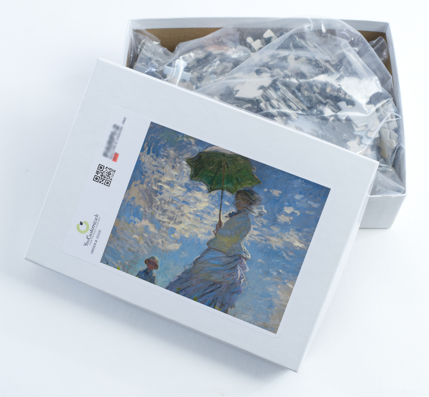 We print our puzzles on thick white chipboard in vibrant colors, then laminate the chipboard and die cut your puzzle. Your jigsaw puzzle is shipped to you in a box with the image of the puzzle on the box.