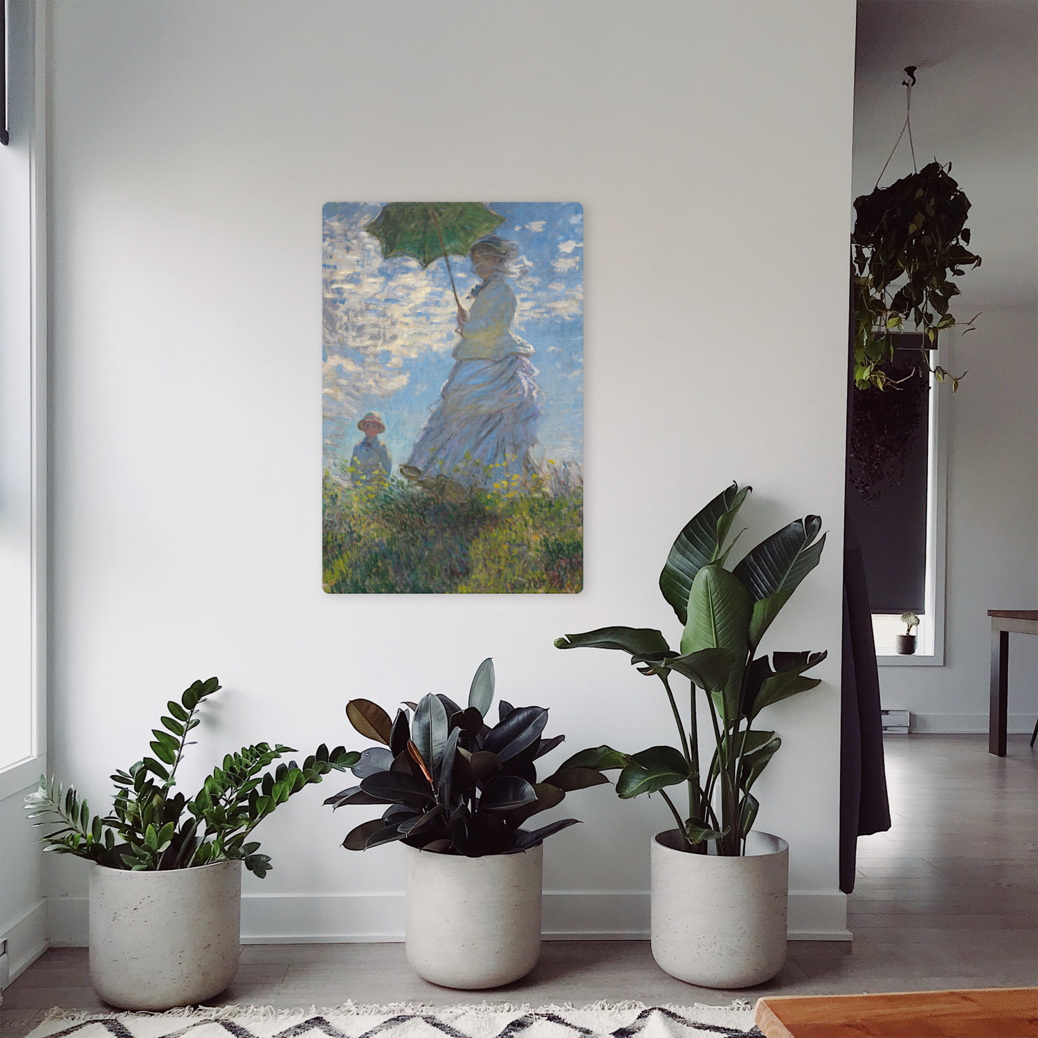 Woman With A Parasol or La Promenade depicts Monet's wife and their son. Although Monet's most obvious strength in his paintings was landscapes, it is quite evident in this painting of his family that he was quite talented at portraying the human figure as well. This painting was intended to be a more candid moment rather than a traditional portrait. In fact, Monet most likely painted this scene in one sitting, maybe even in only a few hours. Monet is quite successful in capturing this typical moment with his family.