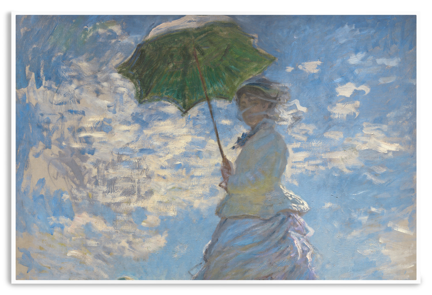 Woman With A Parasol or La Promenade depicts Monet's wife and their son. Although Monet's most obvious strength in his paintings was landscapes, it is quite evident in this painting of his family that he was quite talented at portraying the human figure as well. This painting was intended to be a more candid moment rather than a traditional portrait. In fact, Monet most likely painted this scene in one sitting, maybe even in only a few hours. Monet is quite successful in capturing this typical moment with his family.