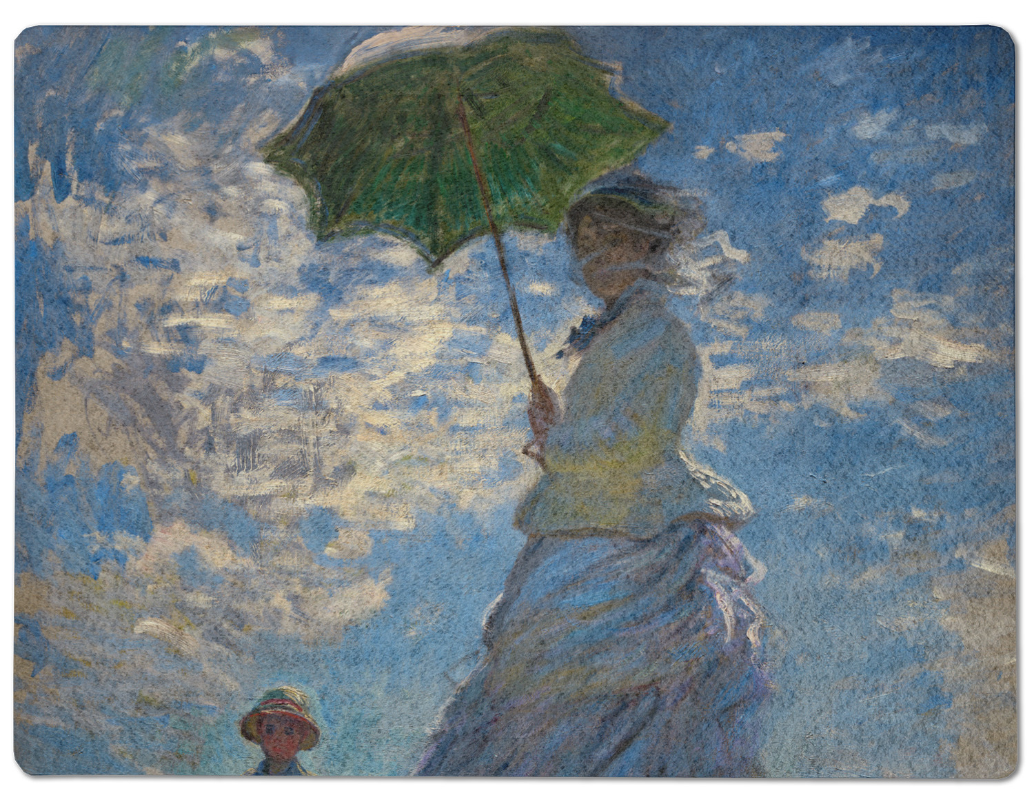 Woman With A Parasol or La Promenade depicts Monet's wife and their son. Although Monet's most obvious strength in his paintings was landscapes, it is quite evident in this painting of his family that he was quite talented at portraying the human figure as well. This painting was intended to be a more candid moment rather than a traditional portrait. In fact, Monet most likely painted this scene in one sitting, maybe even in only a few hours. Monet is quite successful in capturing this typical moment with his family.