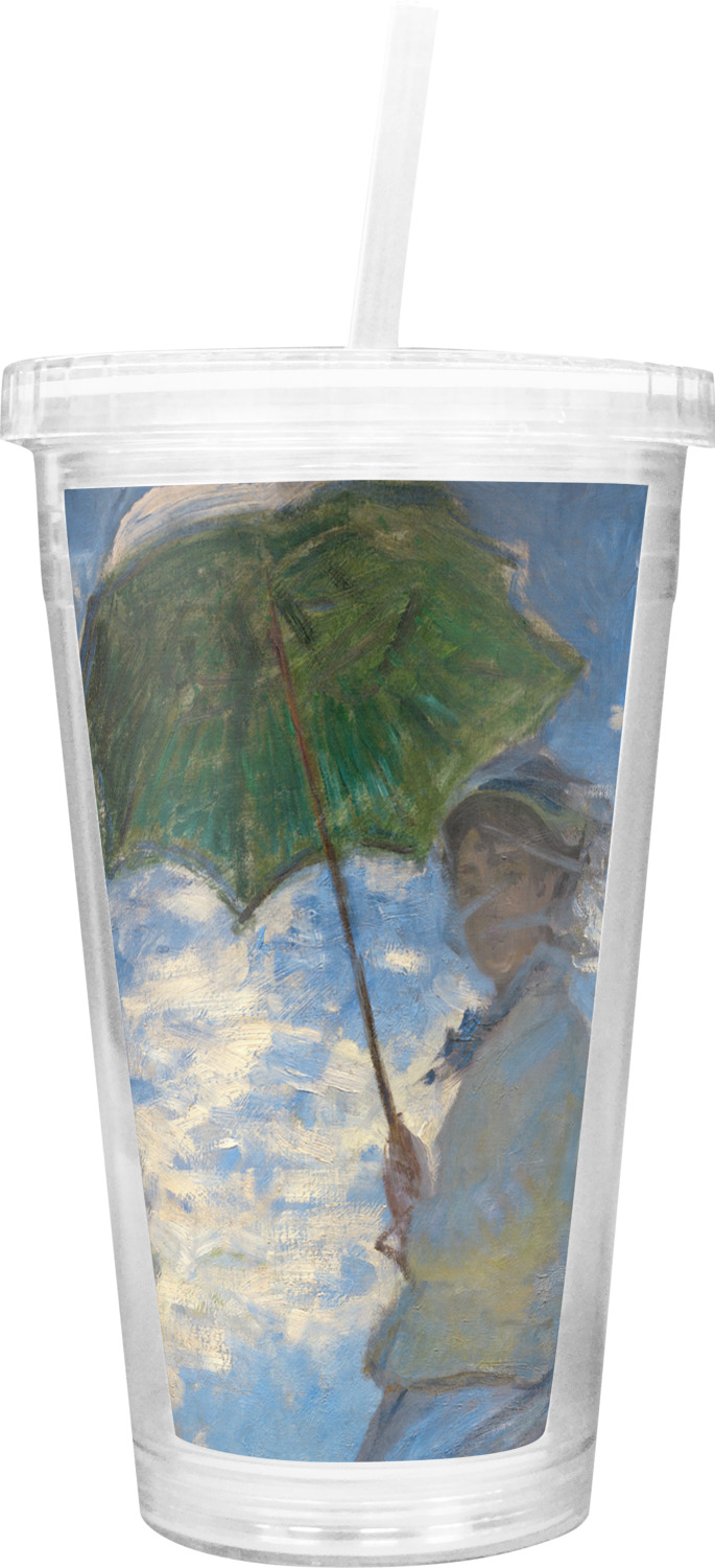 These BPA free tumblers with their double walls keep your drink cold and will not sweat on the outside; they have a clear acrylic top and a reusable straw with a ring around the bottom to keep the straw from falling out.