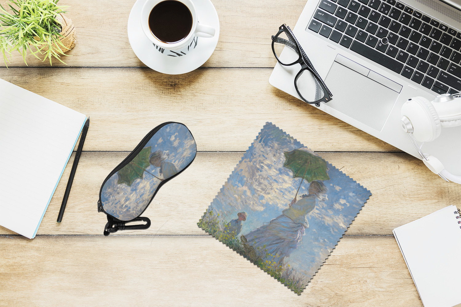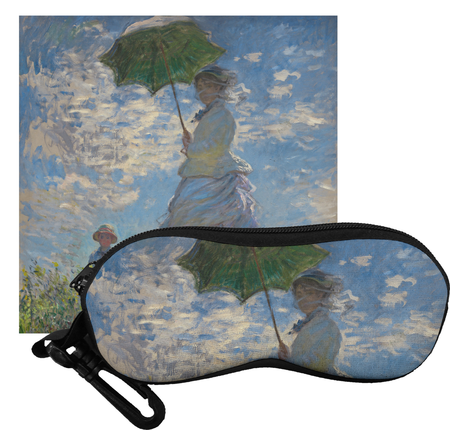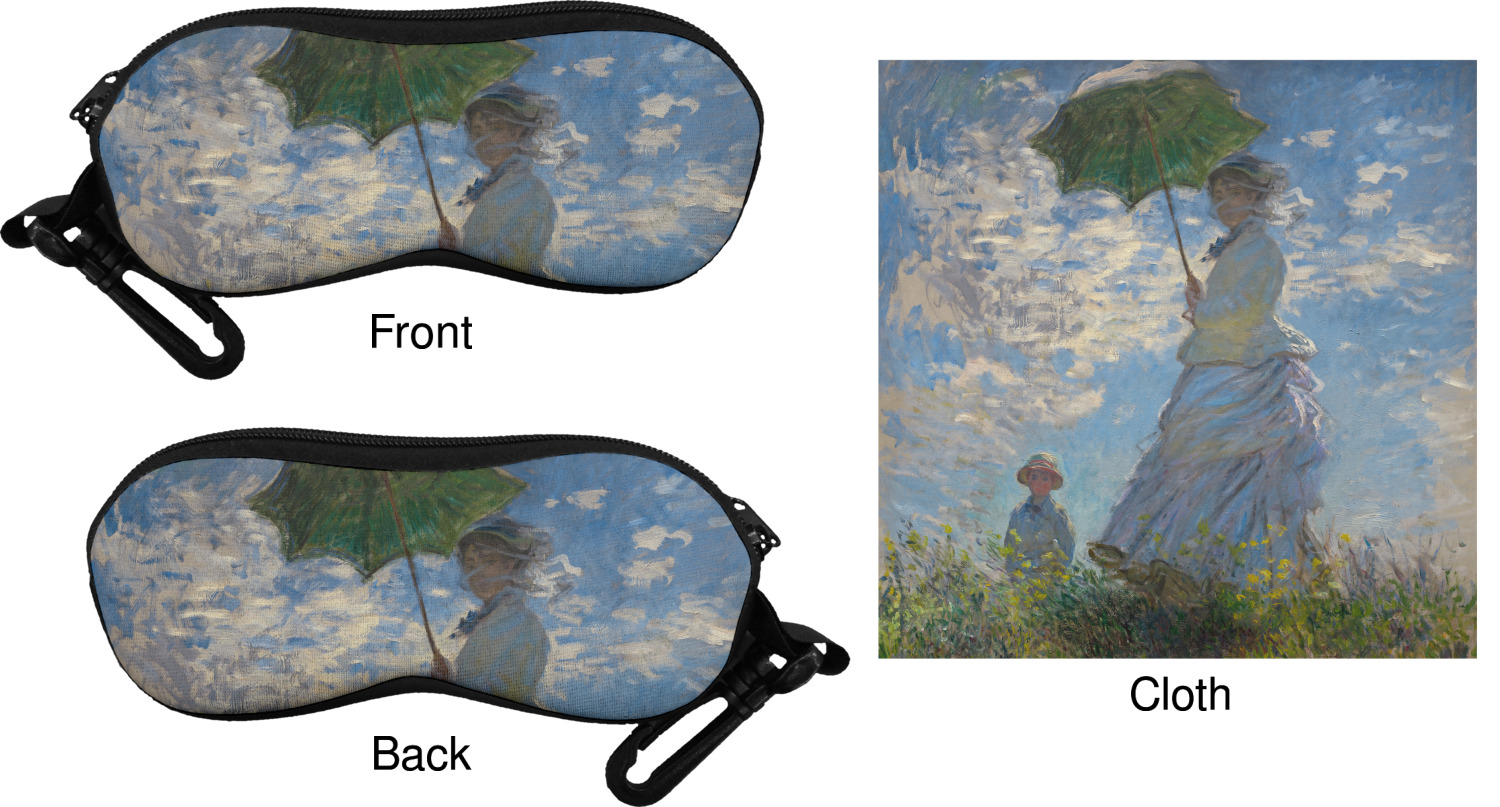 The cases have the design on both sides, a black zipper, and clips for hanging on a belt buckle or purse strap and also include matching lens cloths.