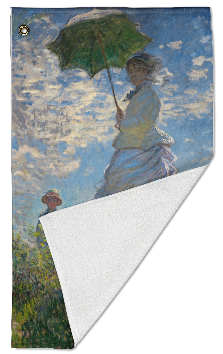 The towel is fully printed / patterned on the front polyester side; and is white on terrycloth cotton backside. The towel has grommet and a pear spring clip in the top left corner. Our golf towels are available in 100s of different prints and patterns.