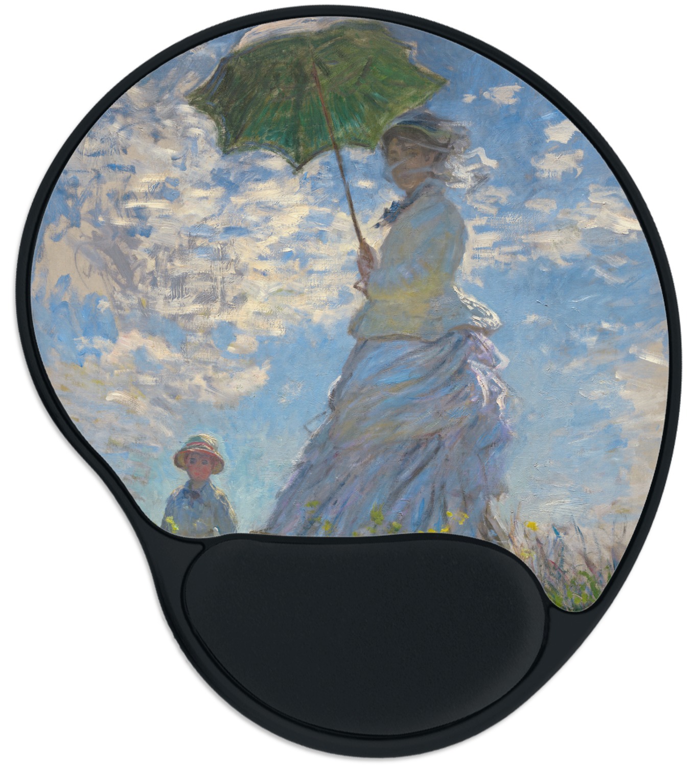 Woman With A Parasol or La Promenade depicts Monet's wife and their son. Although Monet's most obvious strength in his paintings was landscapes, it is quite evident in this painting of his family that he was quite talented at portraying the human figure as well. This painting was intended to be a more candid moment rather than a traditional portrait. In fact, Monet most likely painted this scene in one sitting, maybe even in only a few hours. Monet is quite successful in capturing this typical moment with his family.