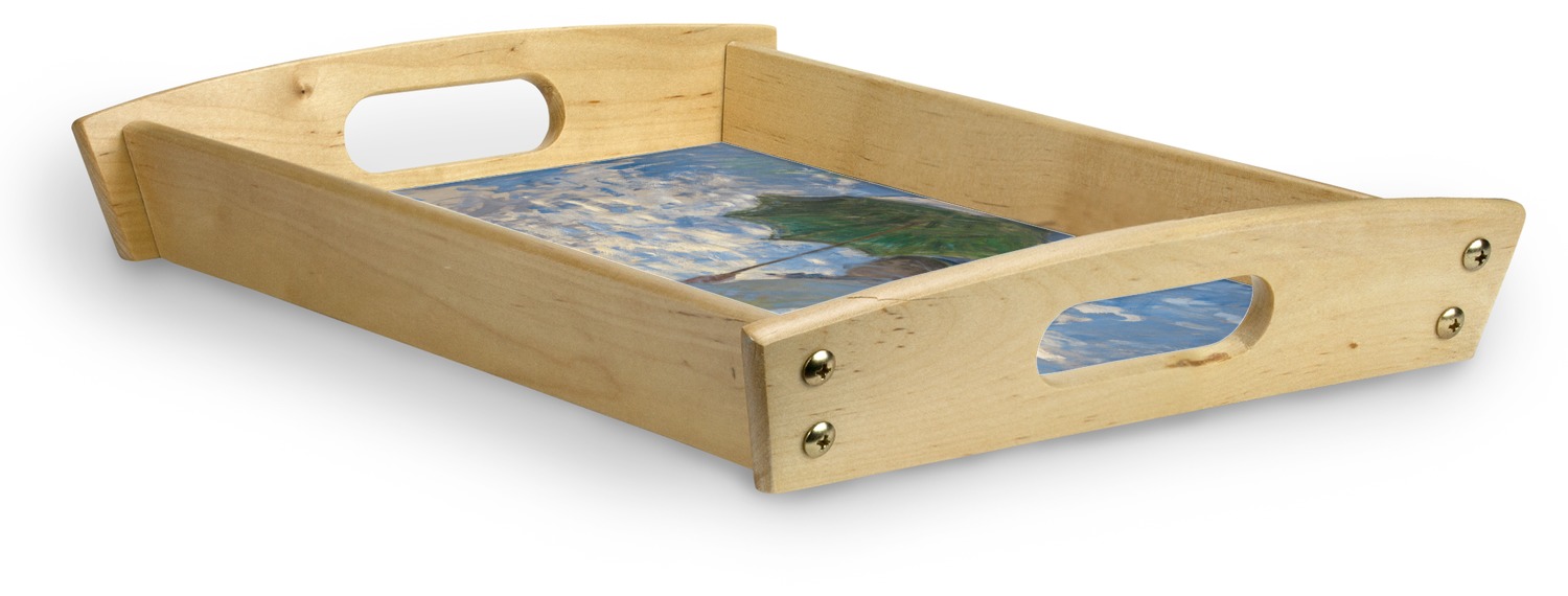 This serving tray with handles features square edges and two rounded sides, creating a very modern look. Each side is fabricated from a beautifully cut, natural wood. The bottom of the interior of the tray displays your customized design in bright, vibrant color. The tray is sold in both a black color and a natural wood look. Each variation of the wood serving tray has two sizes: Small, which is 14" x 10" x 2.25", and Large, which is 19.5" x 13.5" x 2.75".