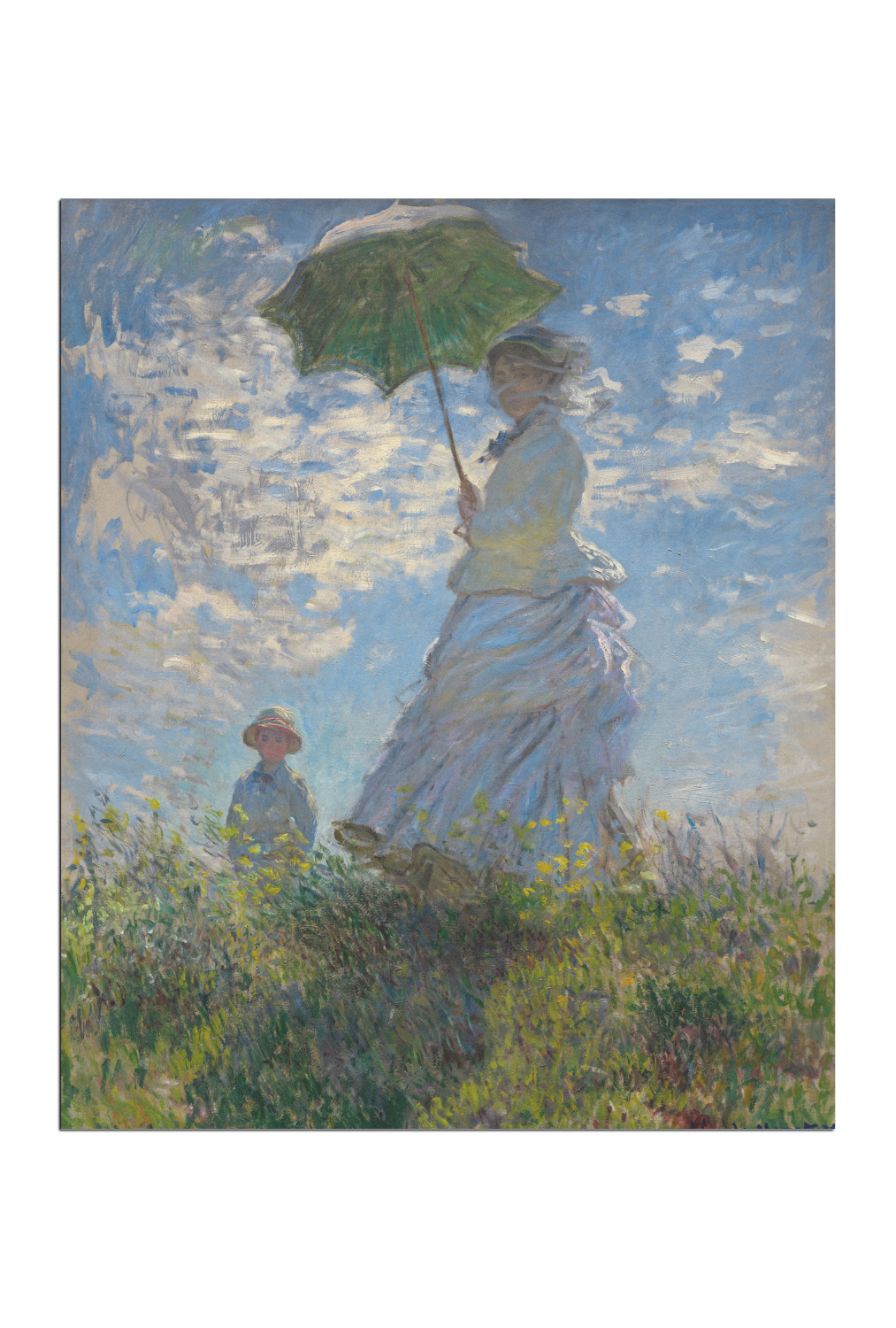 Woman With A Parasol or La Promenade depicts Monet's wife and their son. Although Monet's most obvious strength in his paintings was landscapes, it is quite evident in this painting of his family that he was quite talented at portraying the human figure as well. This painting was intended to be a more candid moment rather than a traditional portrait. In fact, Monet most likely painted this scene in one sitting, maybe even in only a few hours. Monet is quite successful in capturing this typical moment with his family.