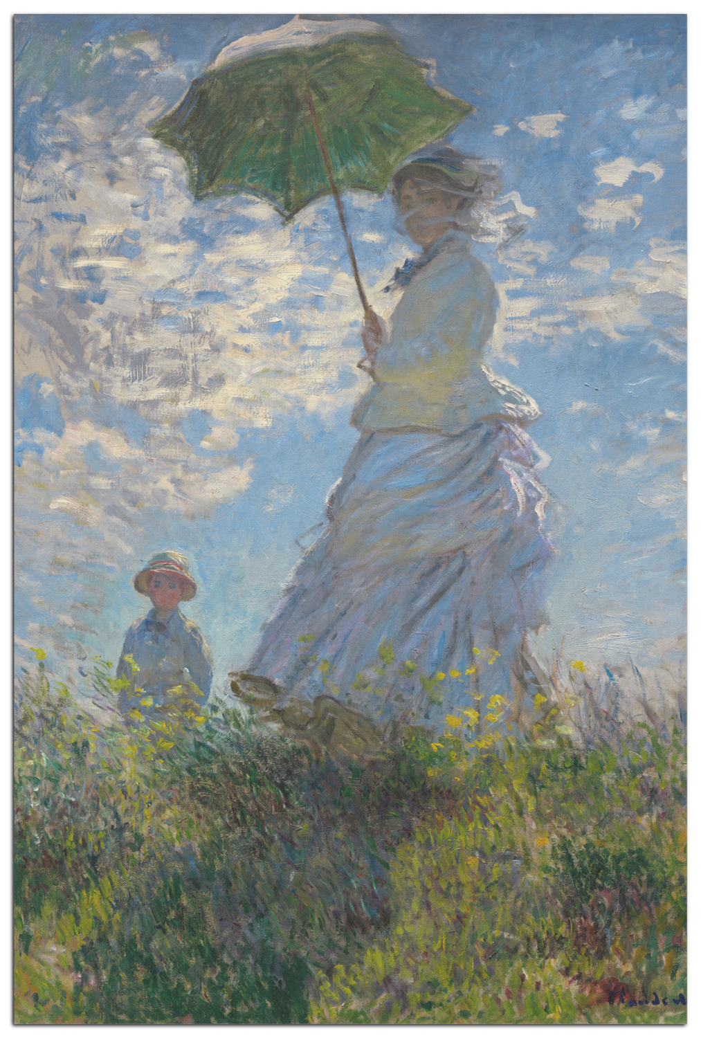 Woman With A Parasol or La Promenade depicts Monet's wife and their son. Although Monet's most obvious strength in his paintings was landscapes, it is quite evident in this painting of his family that he was quite talented at portraying the human figure as well. This painting was intended to be a more candid moment rather than a traditional portrait. In fact, Monet most likely painted this scene in one sitting, maybe even in only a few hours. Monet is quite successful in capturing this typical moment with his family.