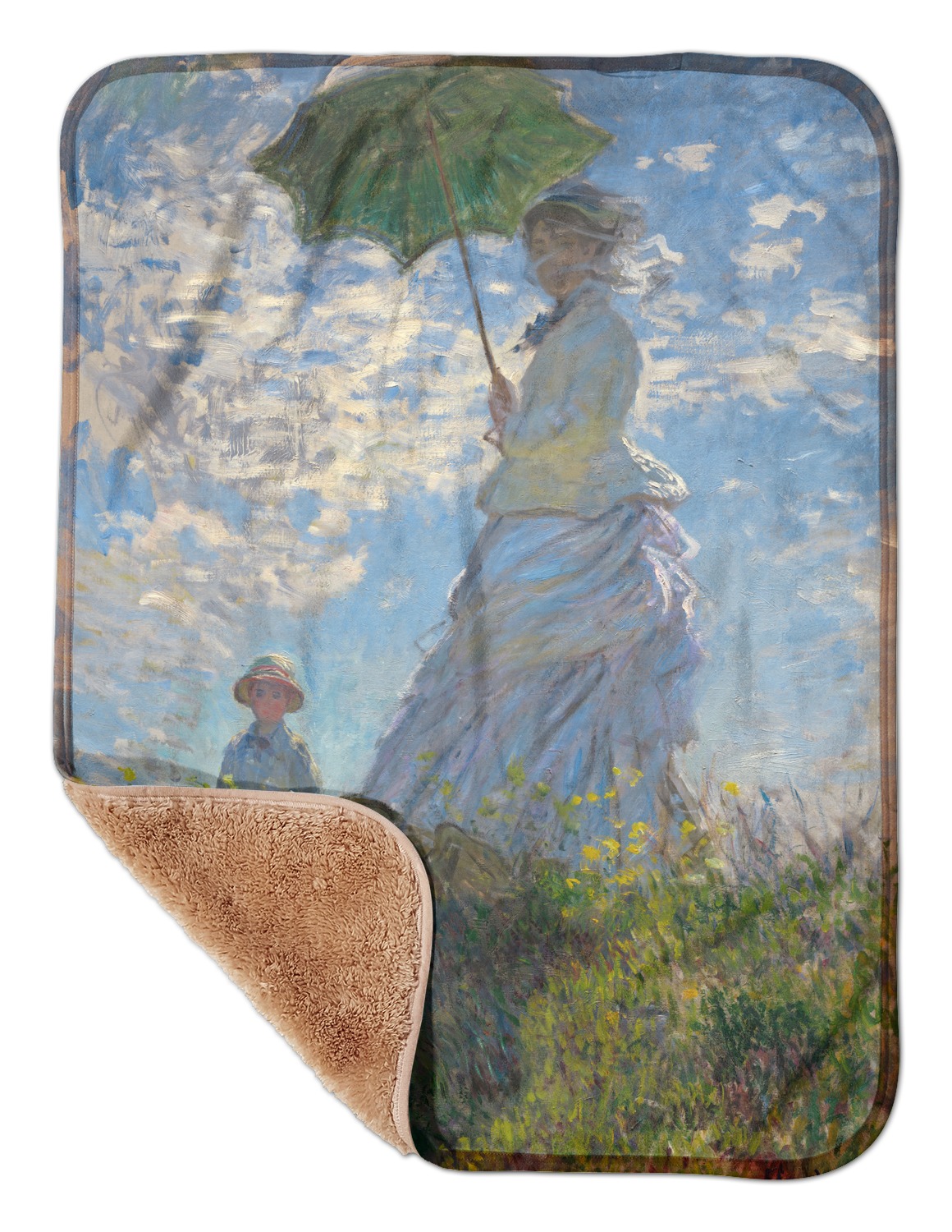 Woman With A Parasol or La Promenade depicts Monet's wife and their son. Although Monet's most obvious strength in his paintings was landscapes, it is quite evident in this painting of his family that he was quite talented at portraying the human figure as well. This painting was intended to be a more candid moment rather than a traditional portrait. In fact, Monet most likely painted this scene in one sitting, maybe even in only a few hours. Monet is quite successful in capturing this typical moment with his family.