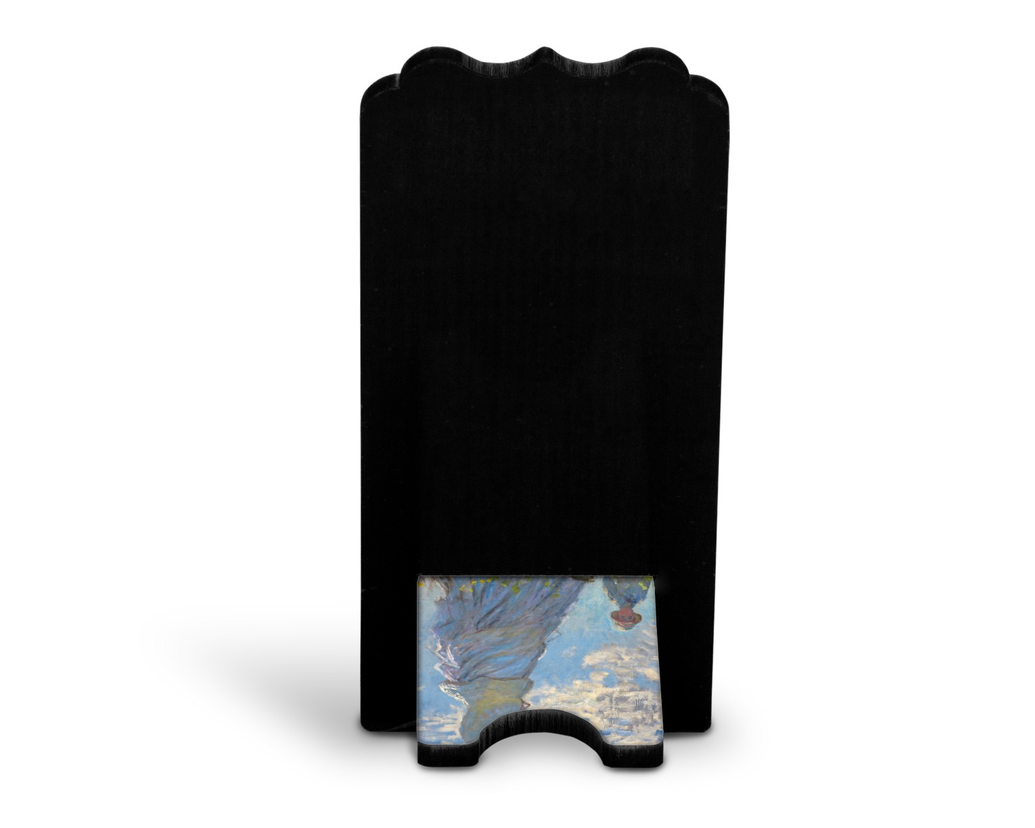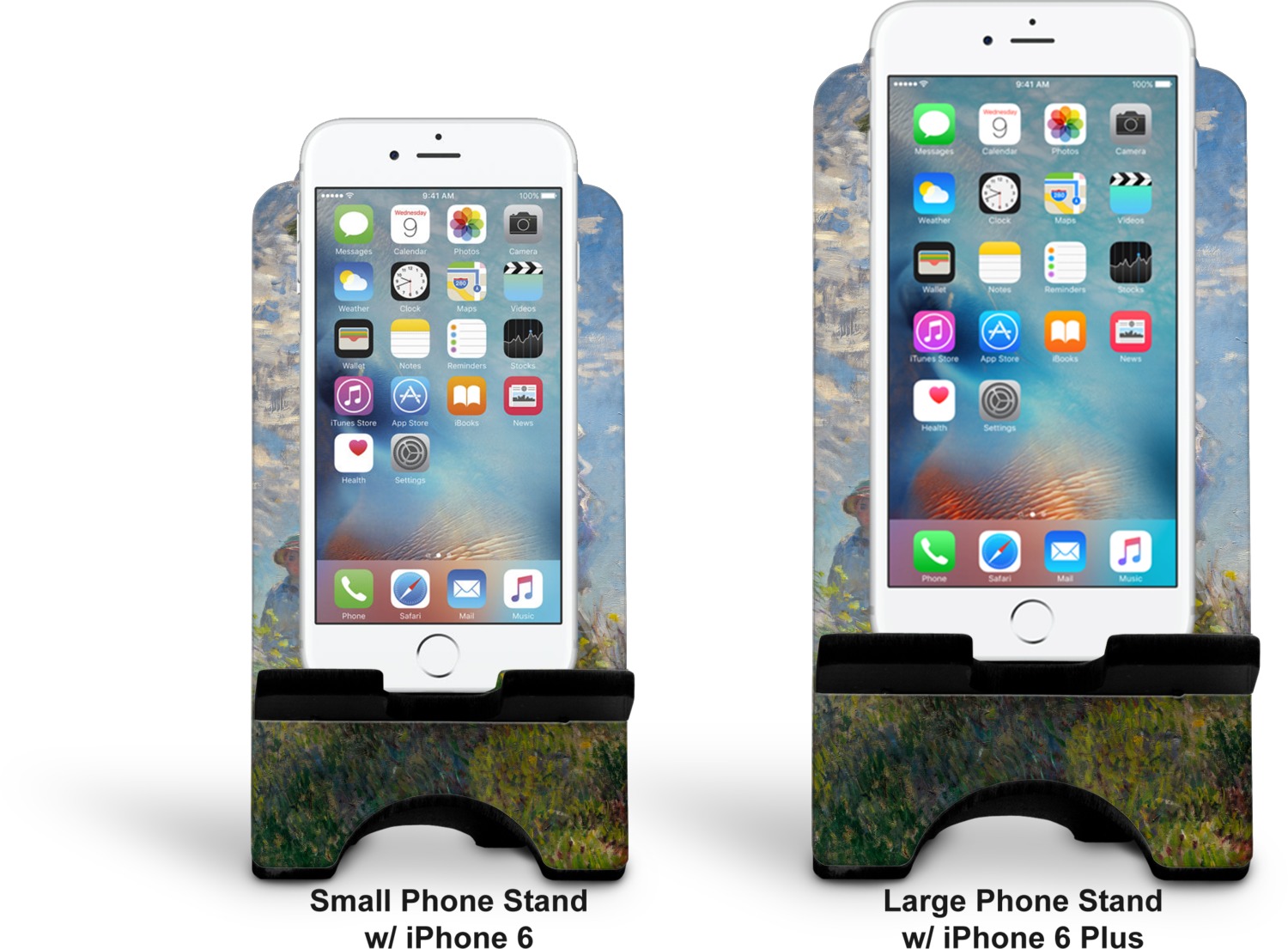 To meet your needs, we offer four variations of this IPhone stand. The backboard of the first version is shaped as a plain, yet sleek rectangle, and is available in two sizes. Our smaller size is approximately 4 by 3.25 by 7 inches, while the larger model is 4 by 3.77 by 8.5 inches. Alongside this model, we also provide you with a more decorative option. The upper part of our second version features a curved edge, for a classy, suave appearance. This phone holder is also sold in two sizes: a smaller version, which is 4 by 3.25 by 7 inches, and our larger model, which is 4 by 3.77 by 8.5 inches. Both models will support large phones, but the larger model is better if you wish to proudly display your personalized design.