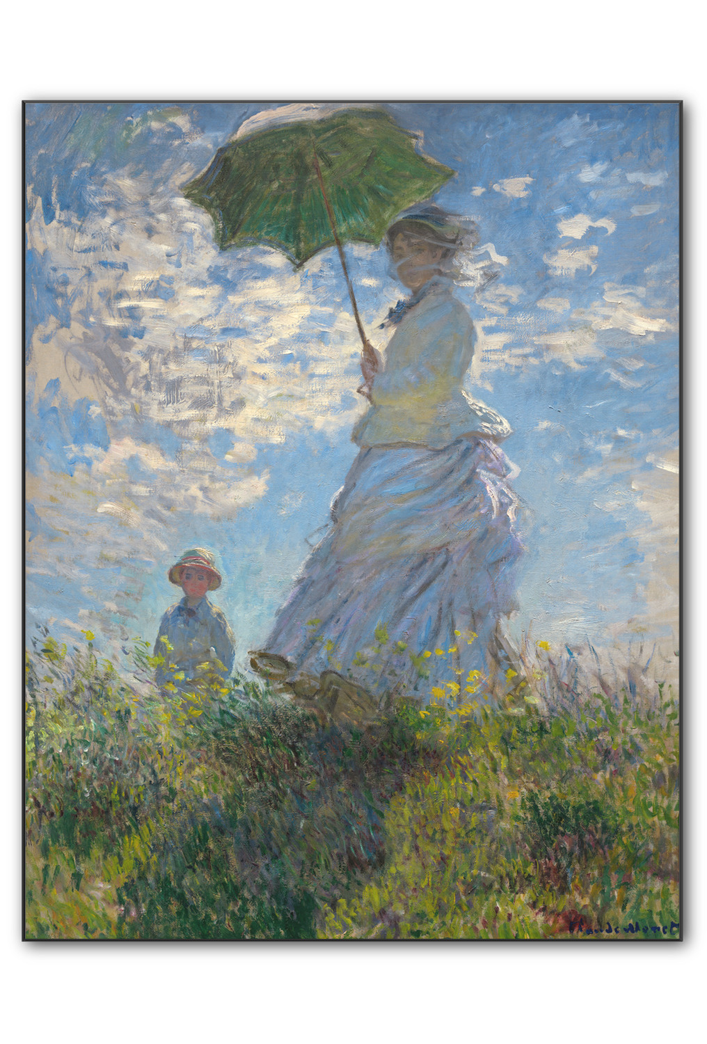 Woman With A Parasol or La Promenade depicts Monet's wife and their son. Although Monet's most obvious strength in his paintings was landscapes, it is quite evident in this painting of his family that he was quite talented at portraying the human figure as well. This painting was intended to be a more candid moment rather than a traditional portrait. In fact, Monet most likely painted this scene in one sitting, maybe even in only a few hours. Monet is quite successful in capturing this typical moment with his family.