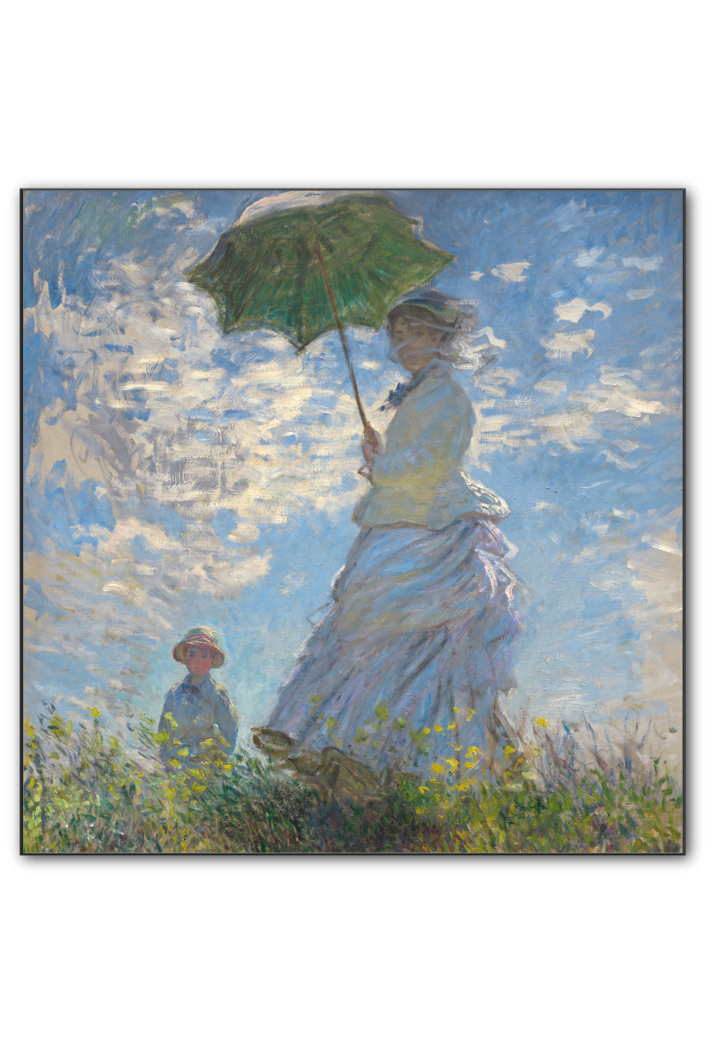 Woman With A Parasol or La Promenade depicts Monet's wife and their son. Although Monet's most obvious strength in his paintings was landscapes, it is quite evident in this painting of his family that he was quite talented at portraying the human figure as well. This painting was intended to be a more candid moment rather than a traditional portrait. In fact, Monet most likely painted this scene in one sitting, maybe even in only a few hours. Monet is quite successful in capturing this typical moment with his family.