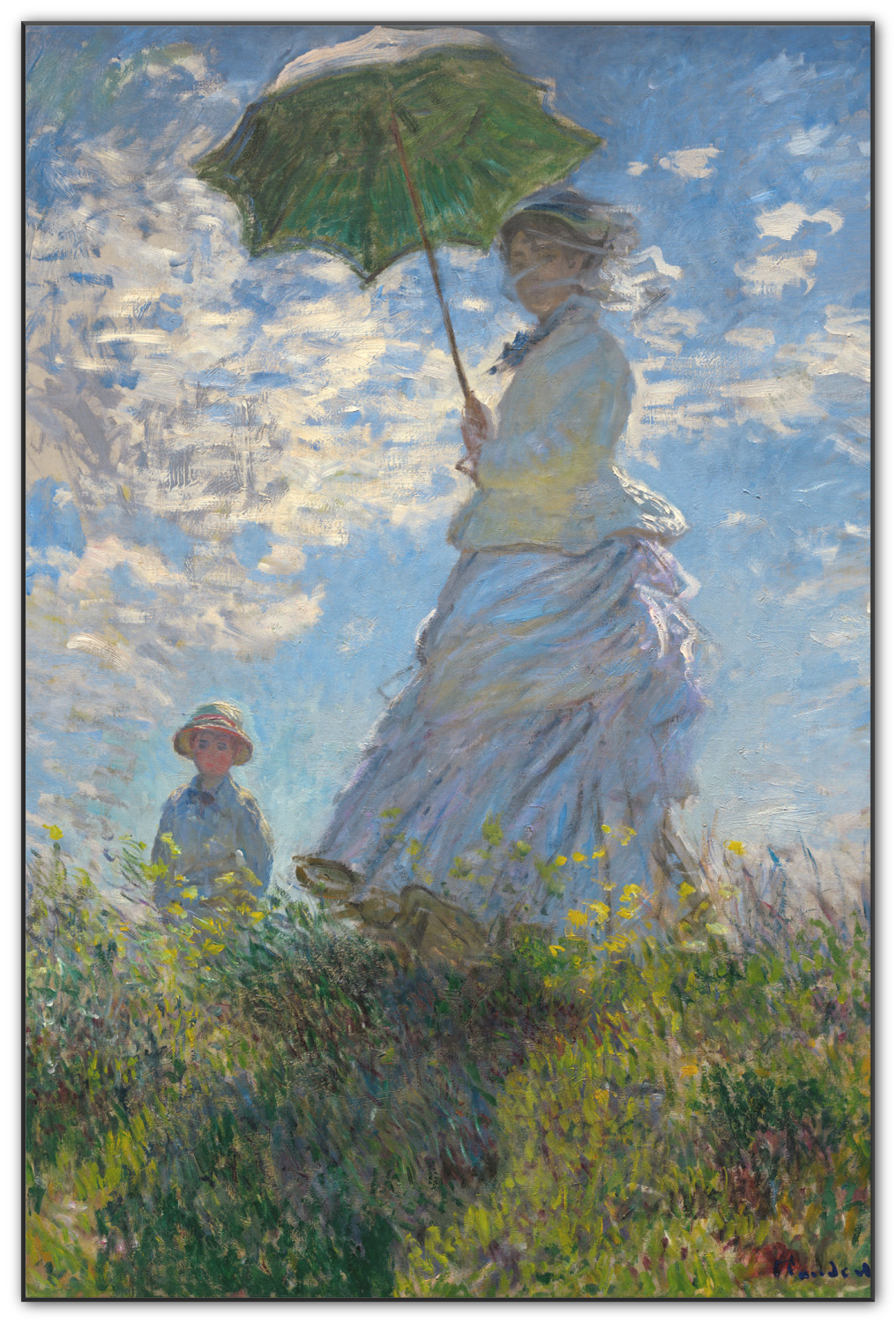 Woman With A Parasol or La Promenade depicts Monet's wife and their son. Although Monet's most obvious strength in his paintings was landscapes, it is quite evident in this painting of his family that he was quite talented at portraying the human figure as well. This painting was intended to be a more candid moment rather than a traditional portrait. In fact, Monet most likely painted this scene in one sitting, maybe even in only a few hours. Monet is quite successful in capturing this typical moment with his family.