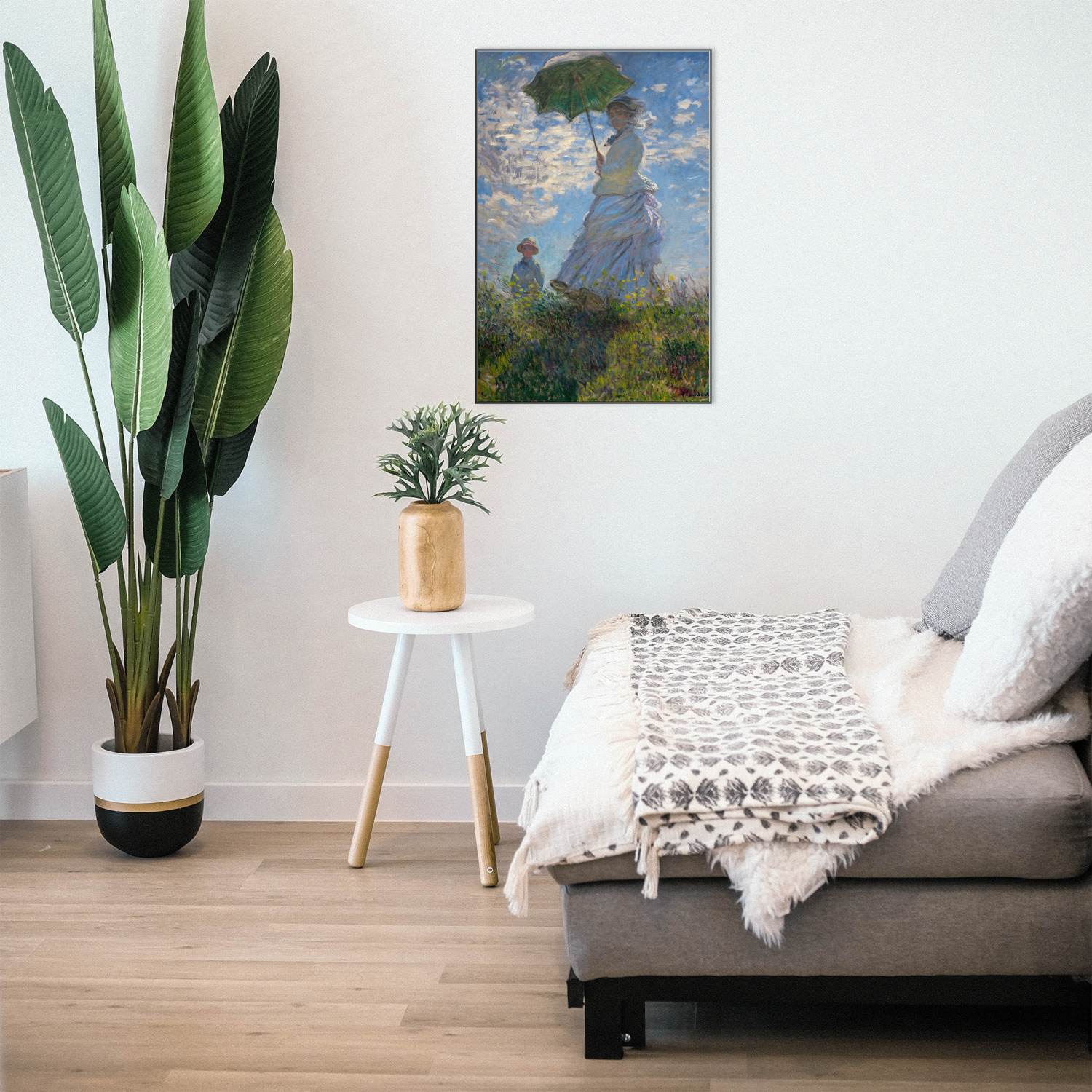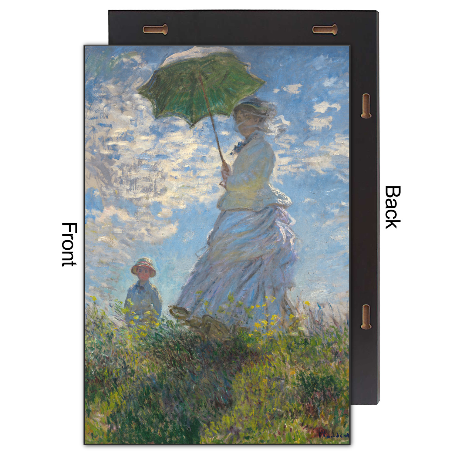 Woman With A Parasol or La Promenade depicts Monet's wife and their son. Although Monet's most obvious strength in his paintings was landscapes, it is quite evident in this painting of his family that he was quite talented at portraying the human figure as well. This painting was intended to be a more candid moment rather than a traditional portrait. In fact, Monet most likely painted this scene in one sitting, maybe even in only a few hours. Monet is quite successful in capturing this typical moment with his family.